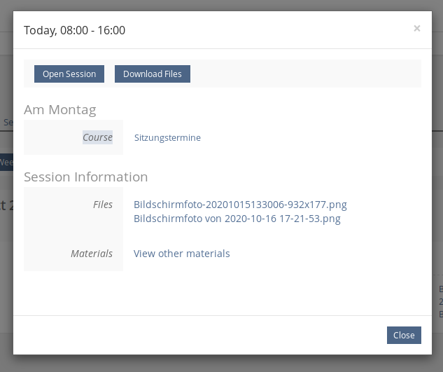 If a session modal is opened, you will see already assigned files. However, all other materials (learning modules, mediacasts, wikis, etc.) are not visible in the modal.