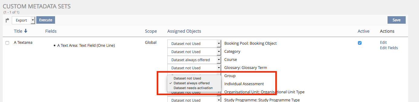 - in Administration > Metadata > Custom Metadata the Individual Assessment is added to the "Assigned Objects" with the three options "Dataset not used", "Dataset always offered" and "Dataset needs activation". This will also be done in the related form, which is opened upon clicking on "edit" at said page.