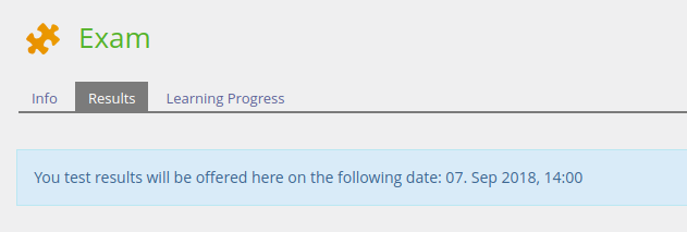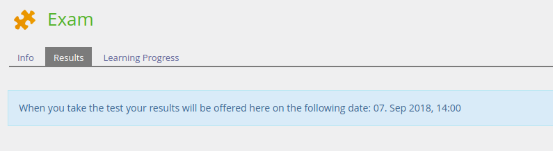 When any result access option is activated the results tab is always visible by now. In case of not yet visible or non existing results, the results tab shows up a corresponding message that depends on the activated option for results access and the fact wether a participant did take the test yet.