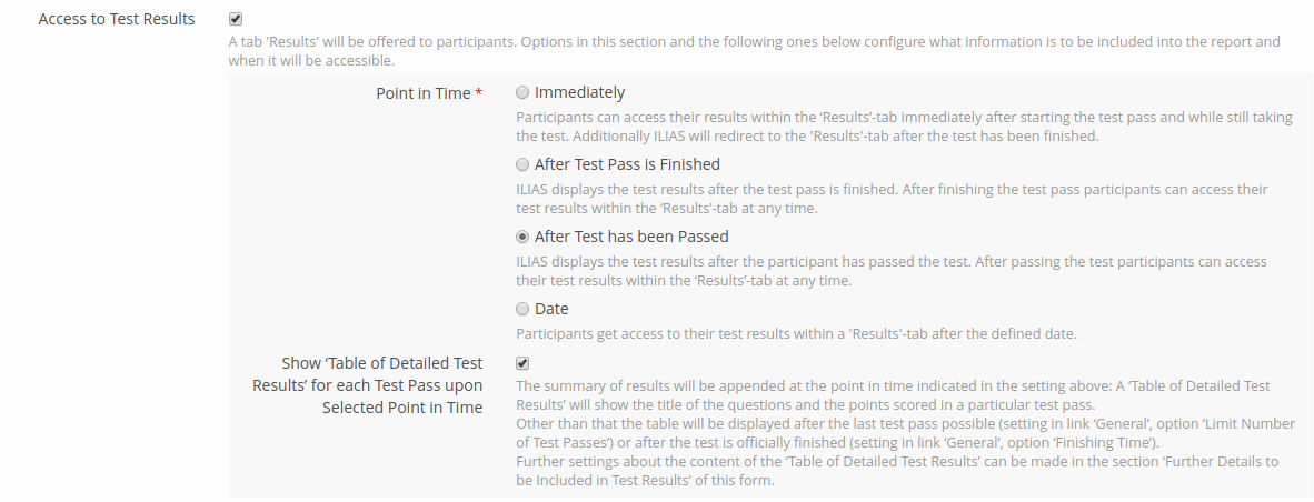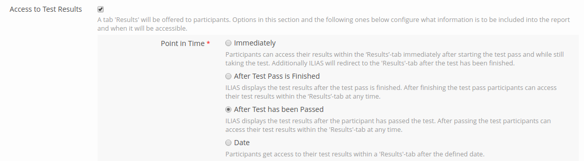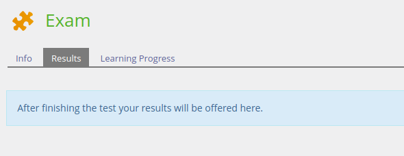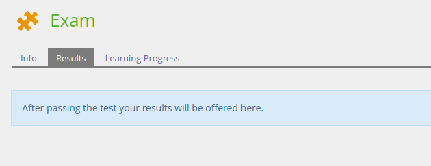 Info text: ILIAS displays the test results after the participant has passed the test. After passing the test participants can access their test results within the ‘Results’-tab at any time.
