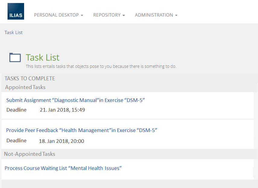 - Title of task (e.g.: »Submit Assignment "Diagnostic Manual" in Exercise DSM-5«)