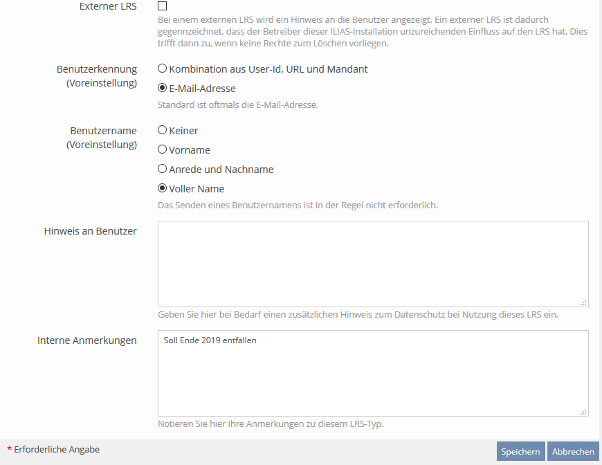 Note: Default values are set via Administation->LRS-Types. It might be useful that users don't have choices to change settings here. Administrators should have the option to make setting for data protection not changeable.
