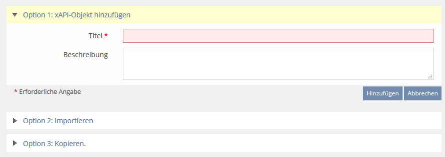 In the first devellopment step (only xAPI Basic Object exists) the screen after clicking on 'Add New Item' and having selected Content->xAPI/cmi5 looks as follows: