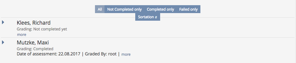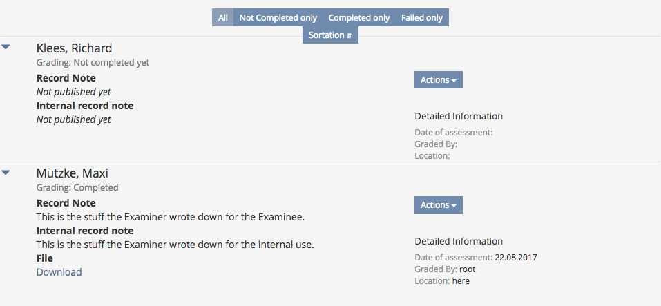 The table will show the name of the examinee as headline and the state of the examination as subheadline. If the examination is finalized, the date of the assessment and the examiner will be shown as "important information".