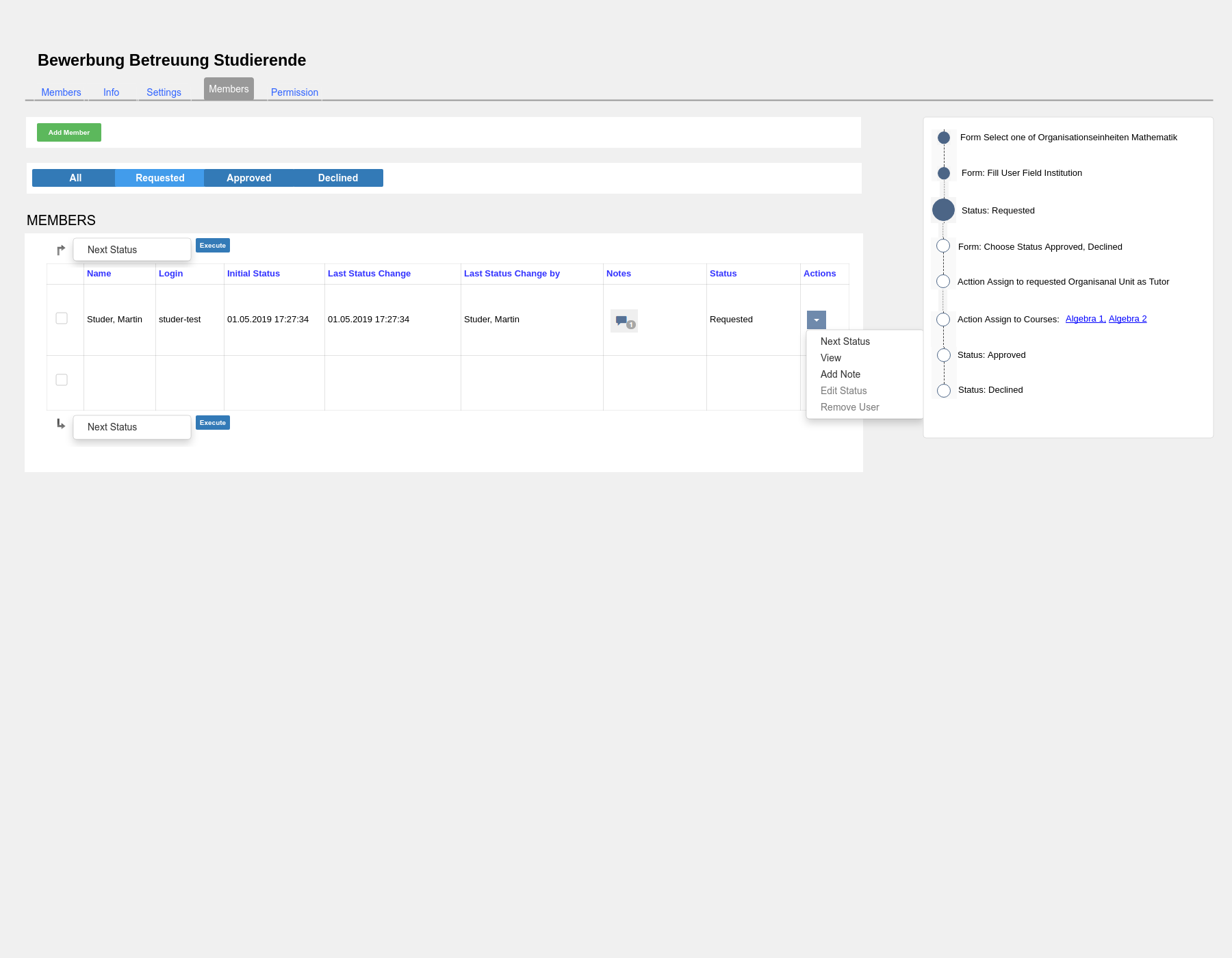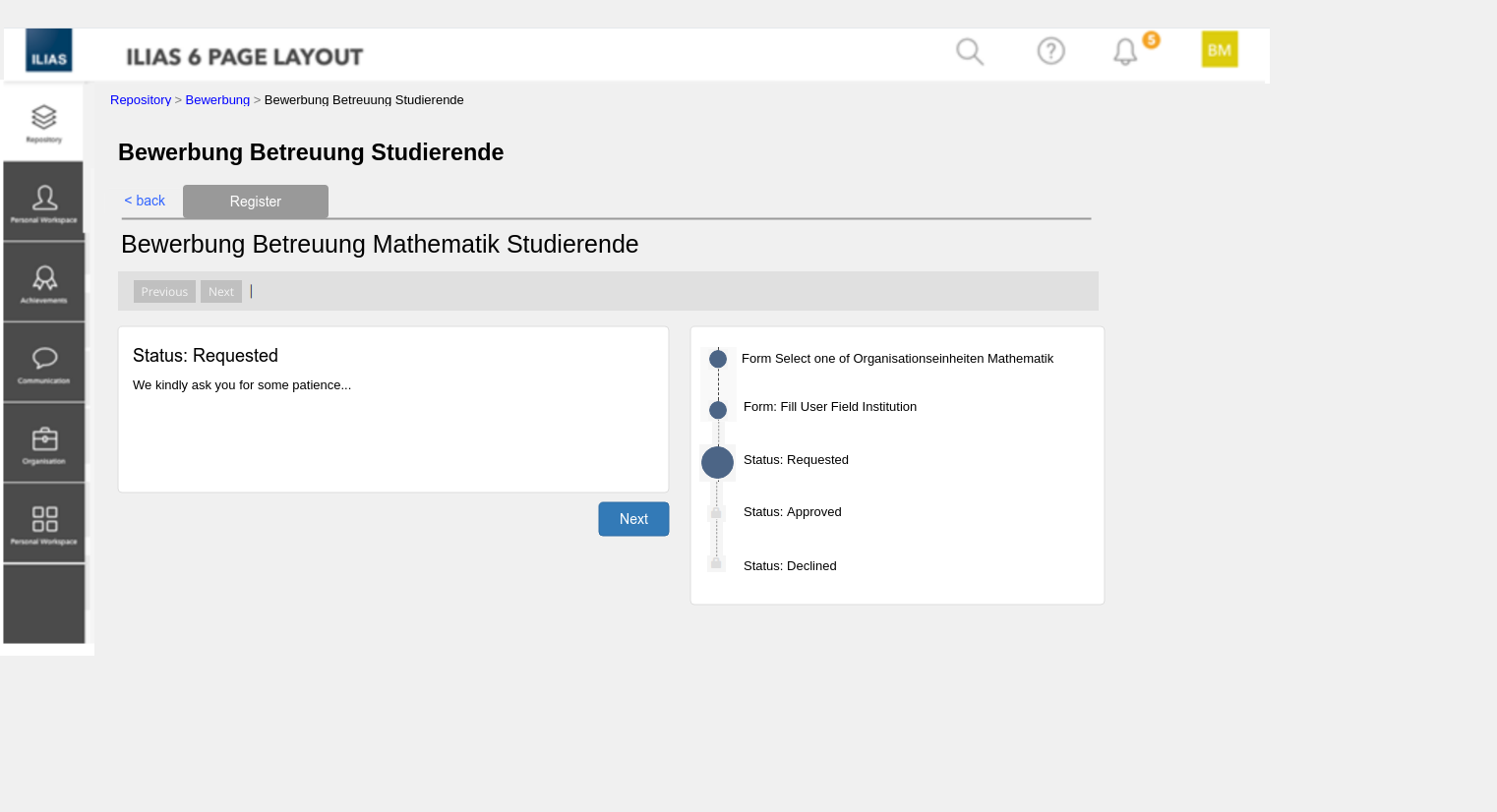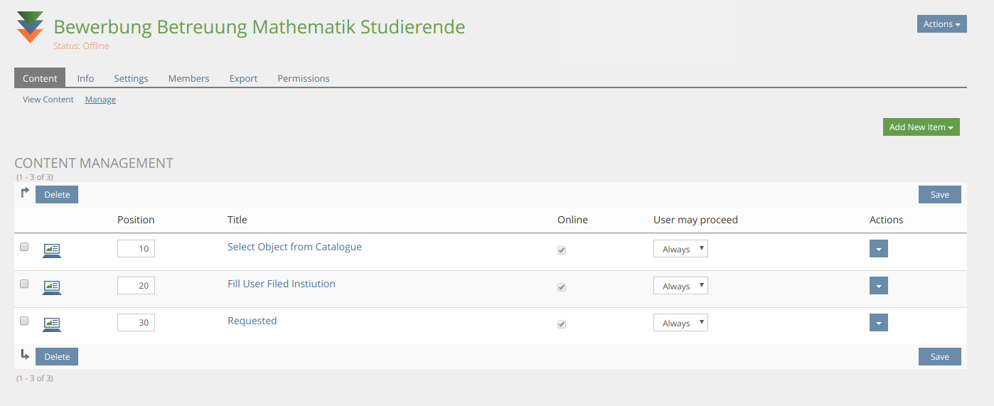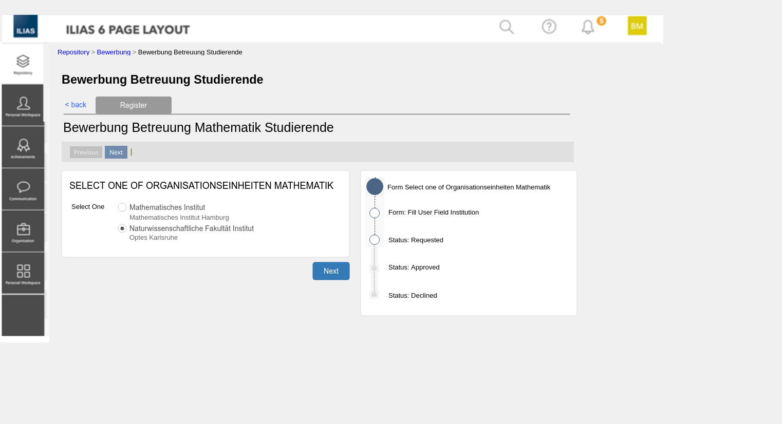 - We had a long discussion about should this feature be a ILIAS Object or a "Service" like comptences placed in the ILIAS Aministration. There are several use cases (decentralized college) for implent this as an ILIAS Object. But the configurable Worfklows seems to be to complicated for a normal ILIAS user. Therefore this should placed in the ILIAS Administration.
