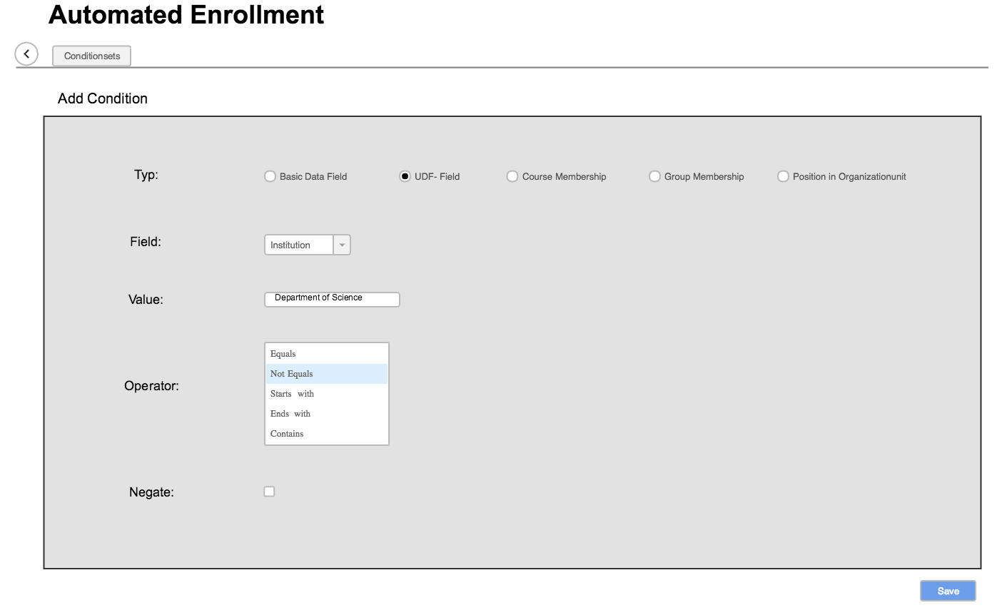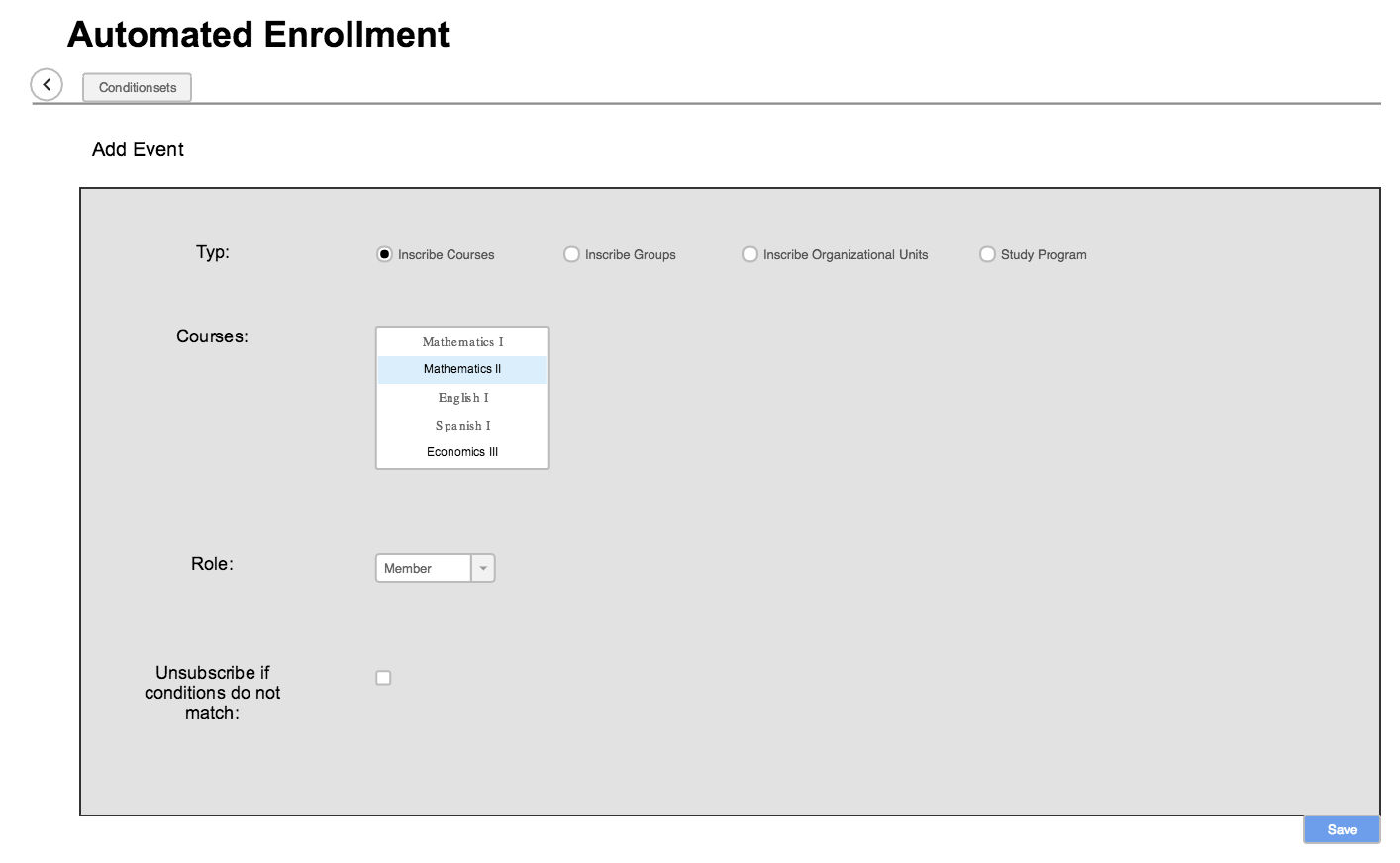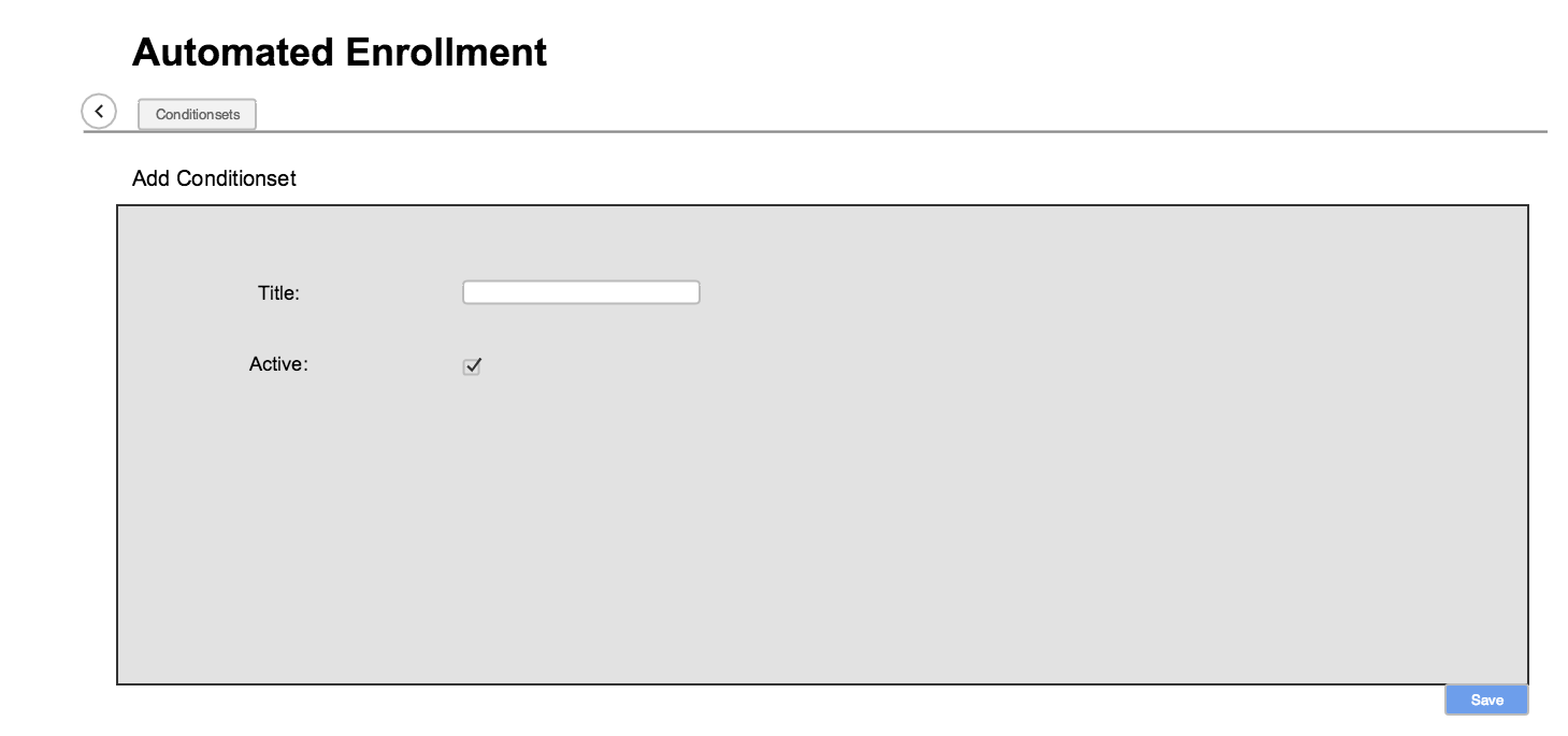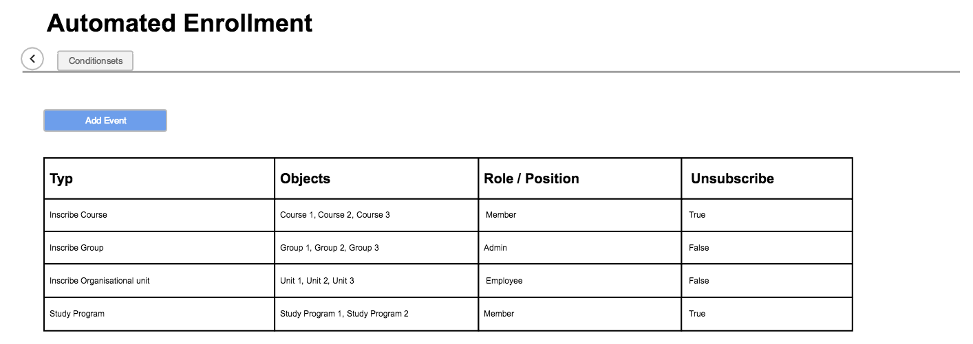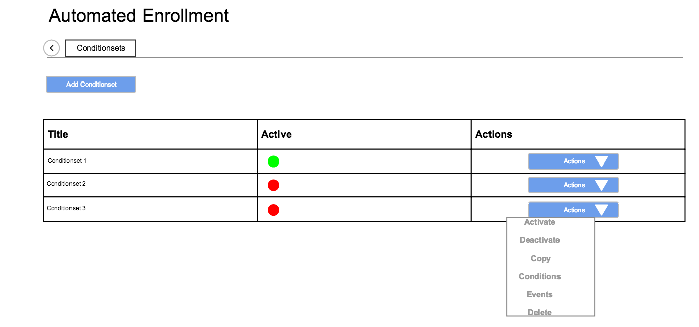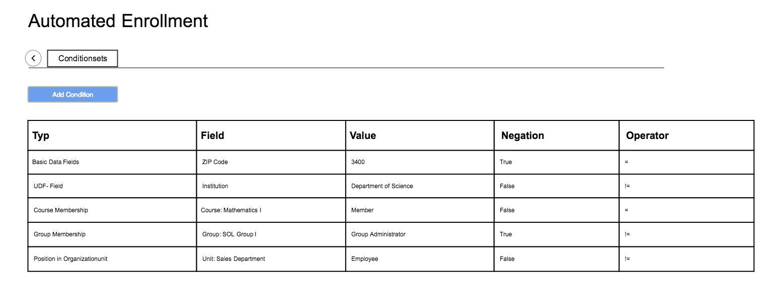 - A new page where the automated enrollment settings start. The view includes a table and a button. The button "add conditionset" directs to View Nr.3.