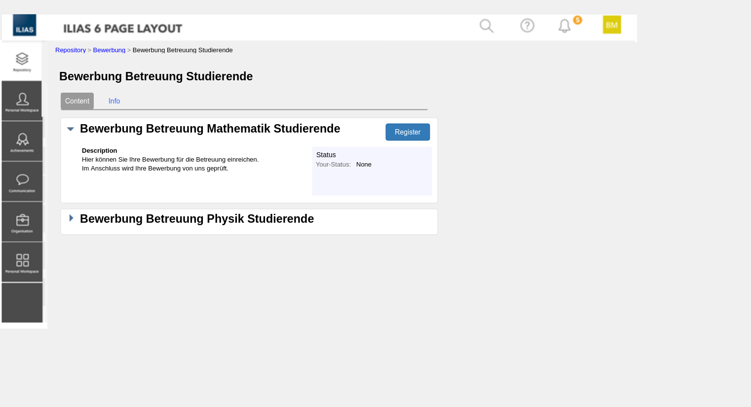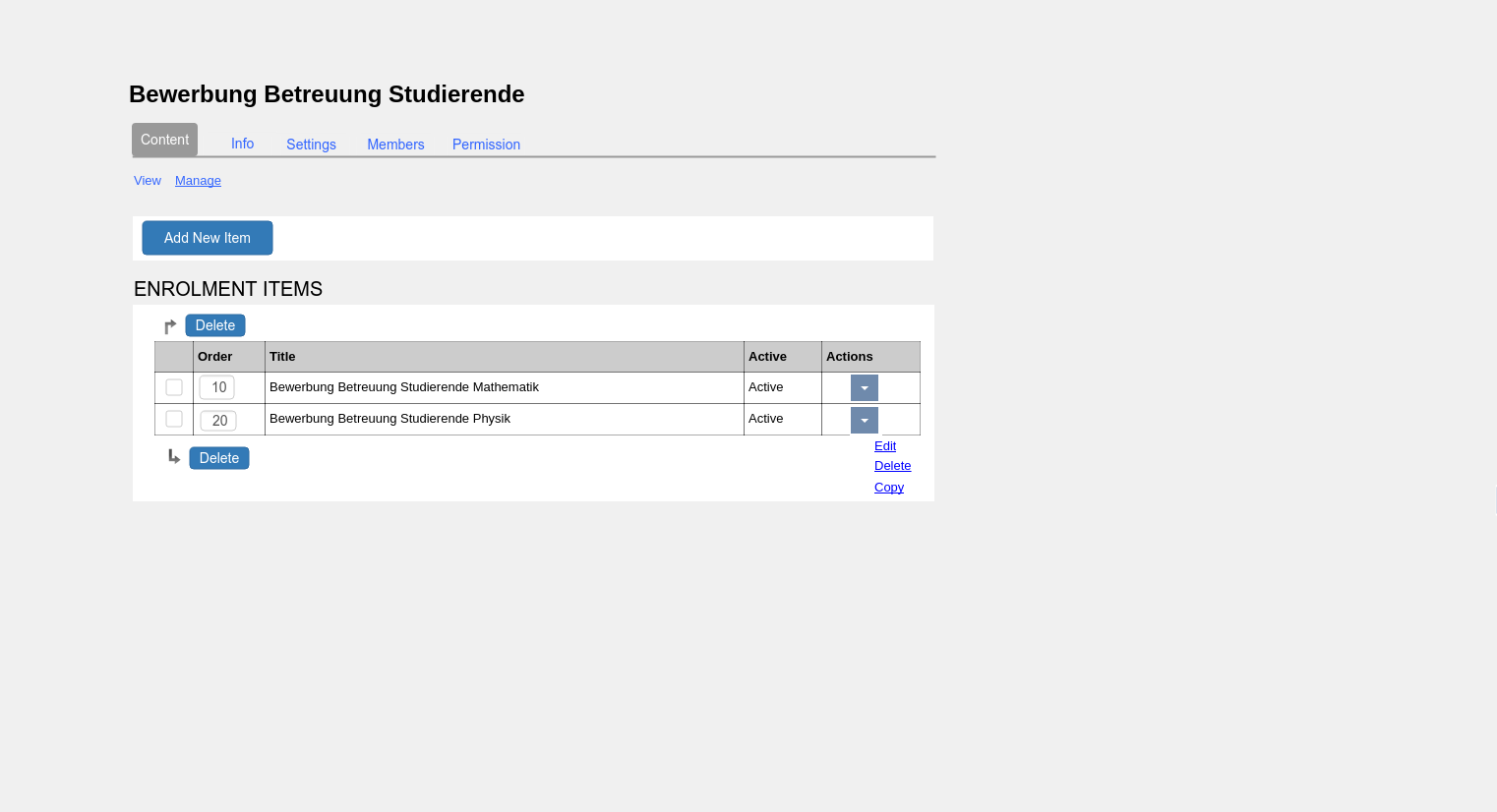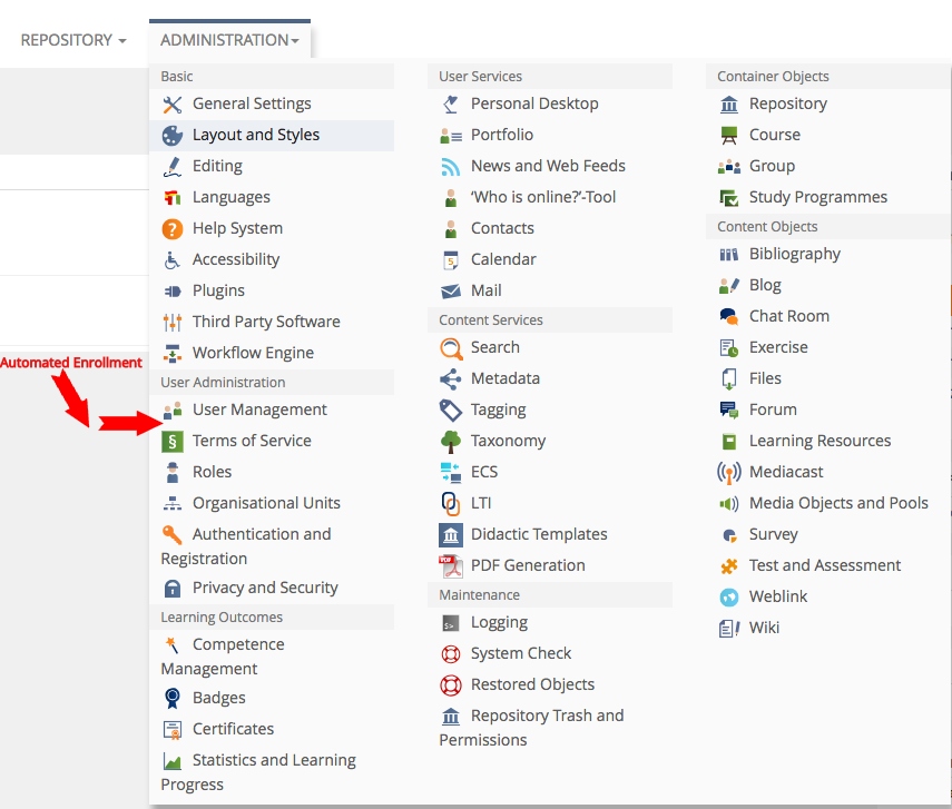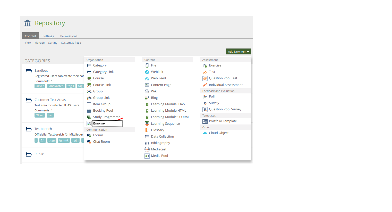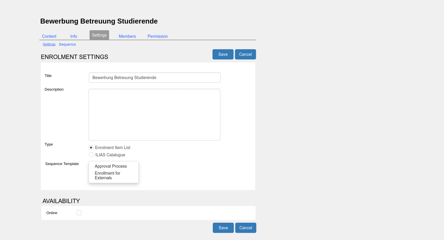 The Enrolment can be combined with ILIAS Objects like Courses, Study Programs, Organisational Units but the object works also in a standalone aproach. In combination with the Catalogue Object it has an outstanding functionality.