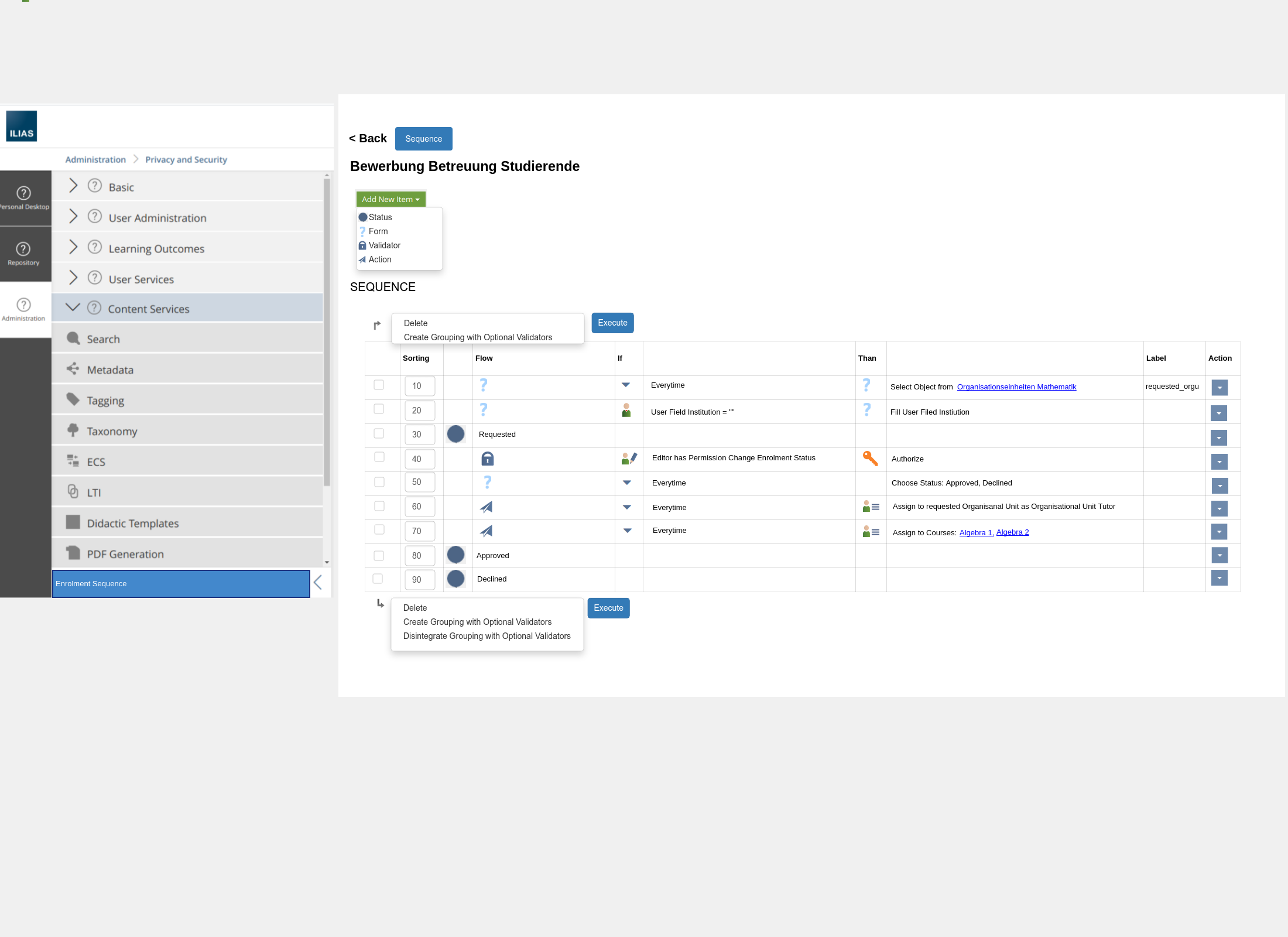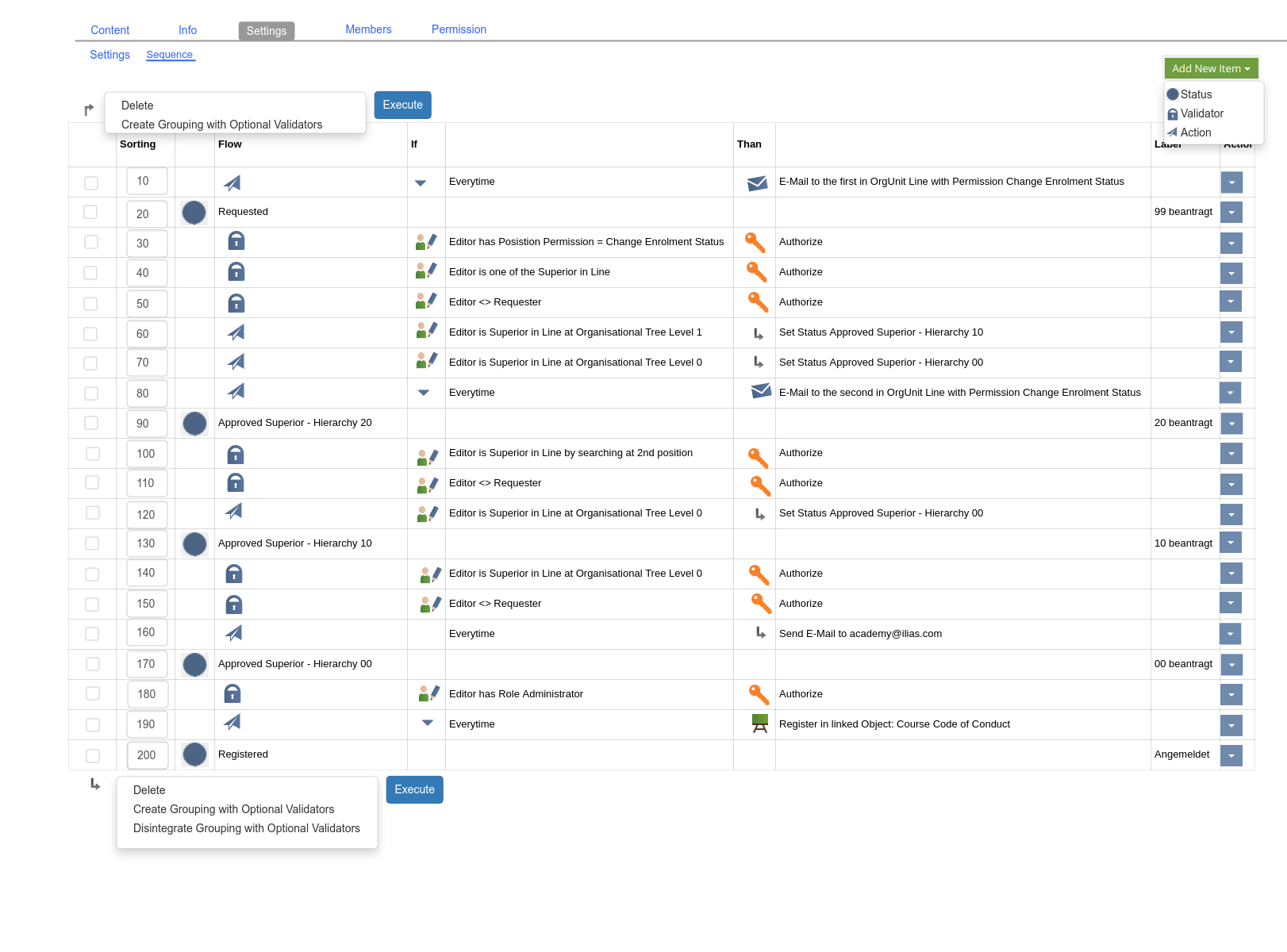 Killing, Alexander [alex], 14 May 2019: Looking at the "sequence settings" mockup, this seems to be mainly a workflow engine (Verification of process status, Determine the authority of users, Execute Task), right? How would this relate to the existing one in ILIAS? Could this work together (maybe on the base of the envisaged API alignment)?