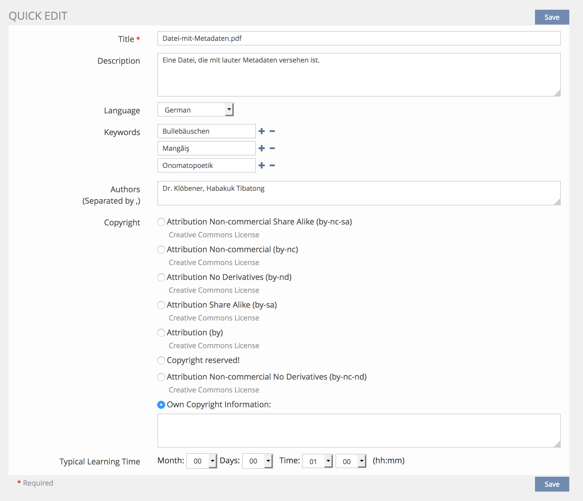 - All objects with "Own Copryright Information" selected but without an entry in the following input are automatically set to the new default "All rights reserved" (see chap 4).