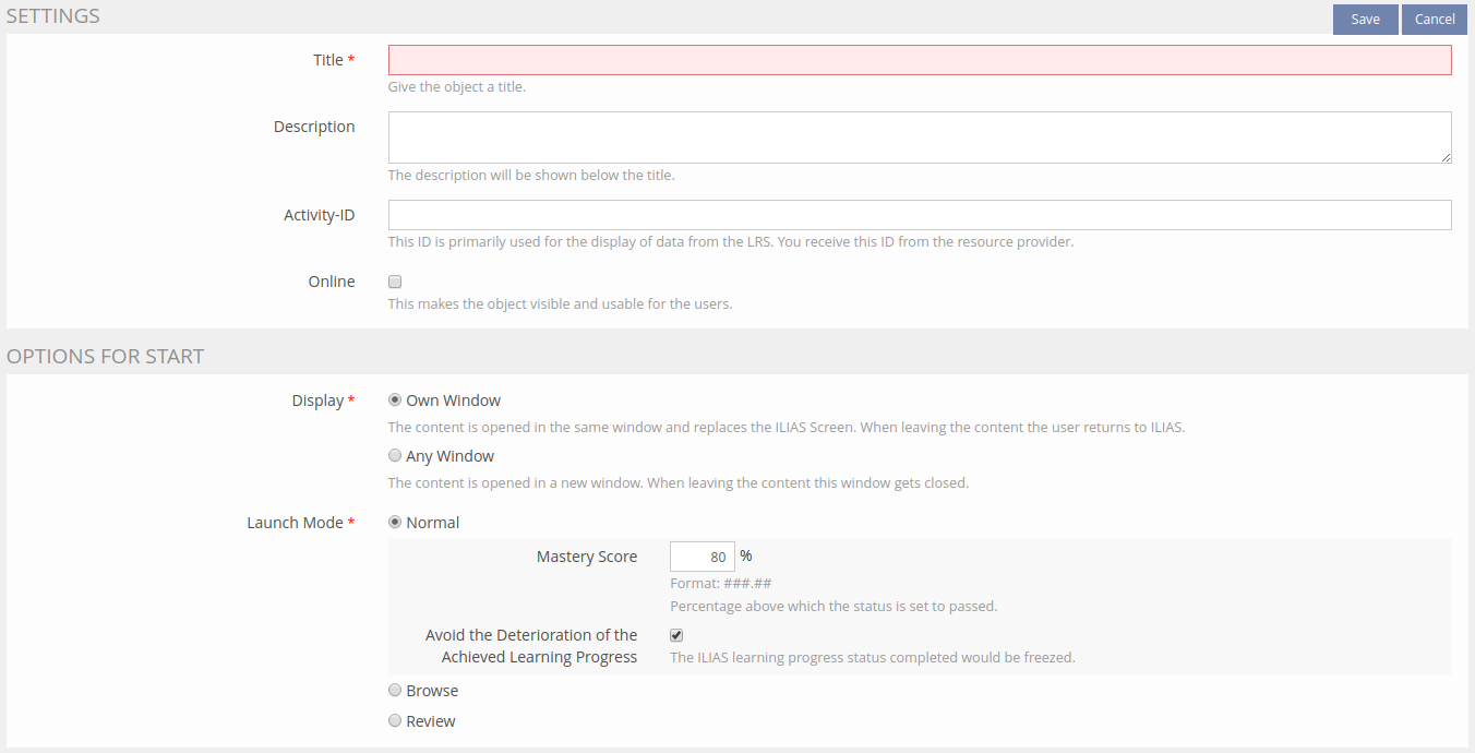 For xAPI in general, I would like to delete the first two SCORM options (they are required by the SCORM-specifications) in terms of simplification and usability. Only for cmi5 (used particularly for Learning Modules) 'launch Mode' is needed with the possible values: normal, browse and review.