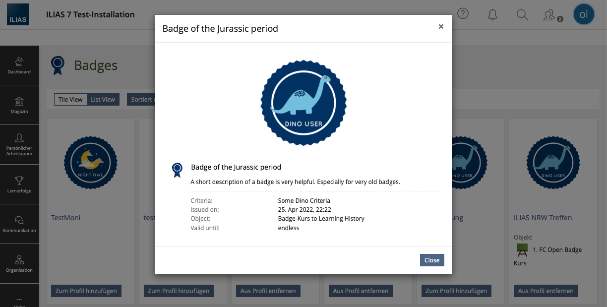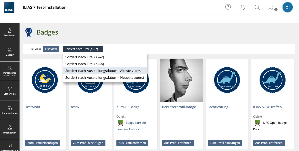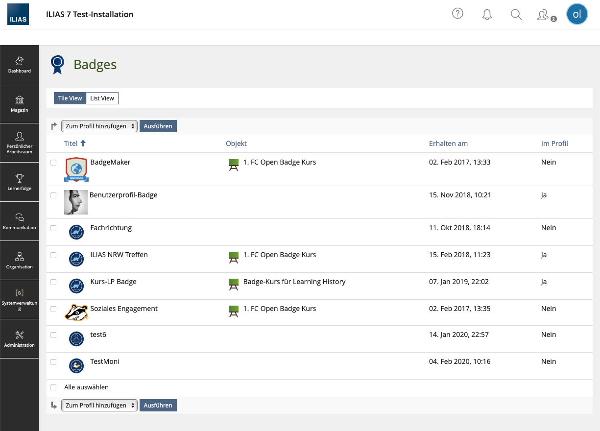 - C49957 : Badges zum Persönlichen Profil hinzufügen (Listenansicht) ILIAS 9