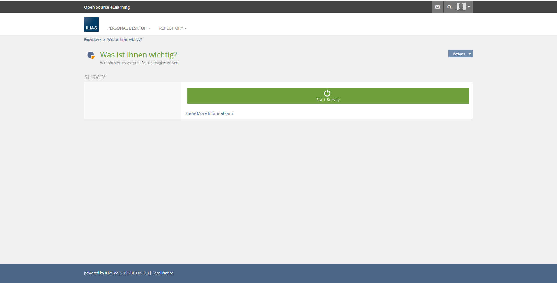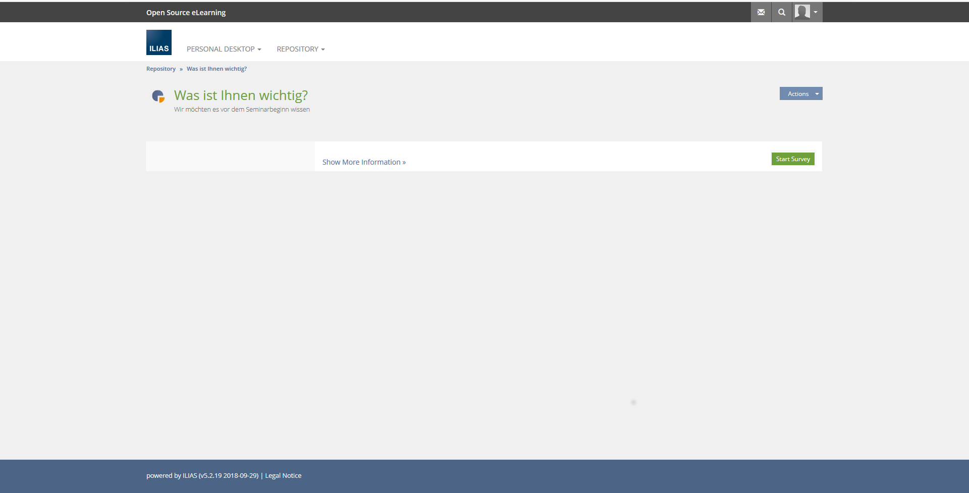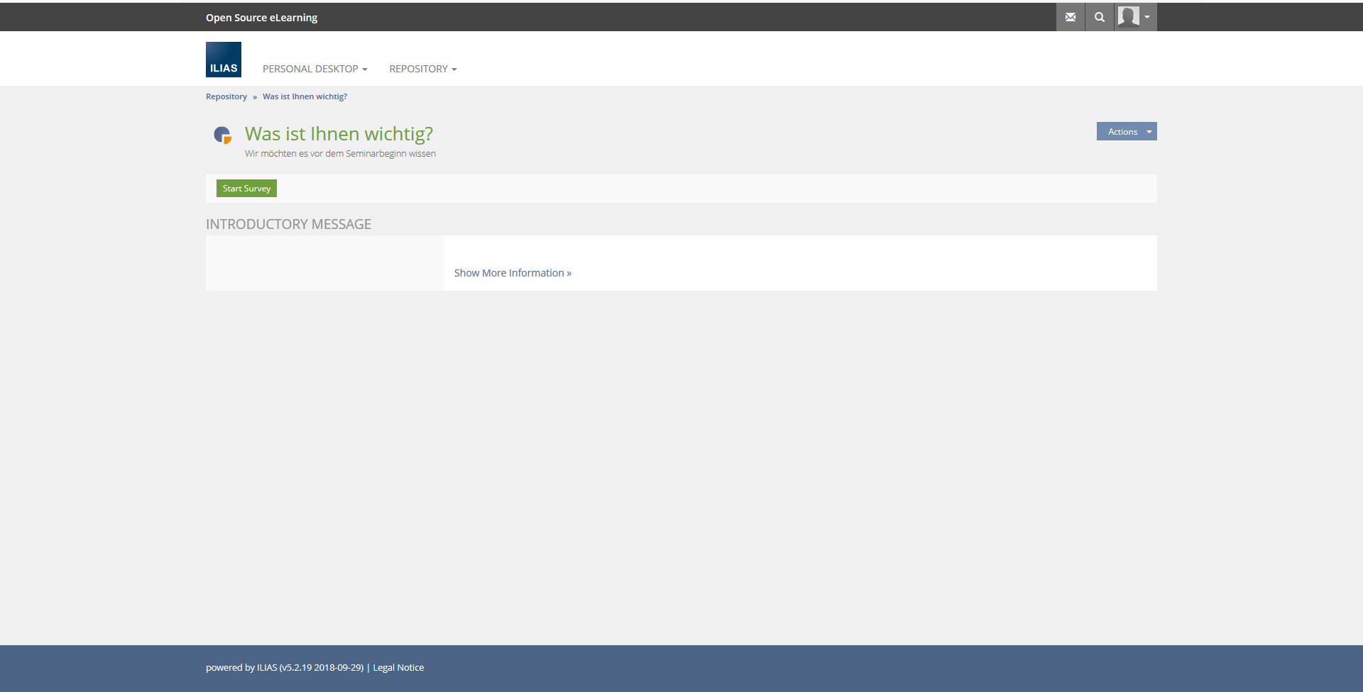 Lauener, Hansjörg [lauener], 20. Nov. 2018. I additional suggest: a) The grey box appears because the first maintainer implemented the start of surveys and tests in the Info-tab. Get rid of this unnecessary empty "grey screen". And b) This bulky button is toooo big for me. I personally think we should only move the current start-button below the introduction-text.