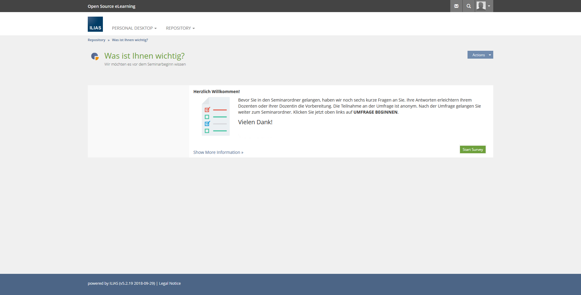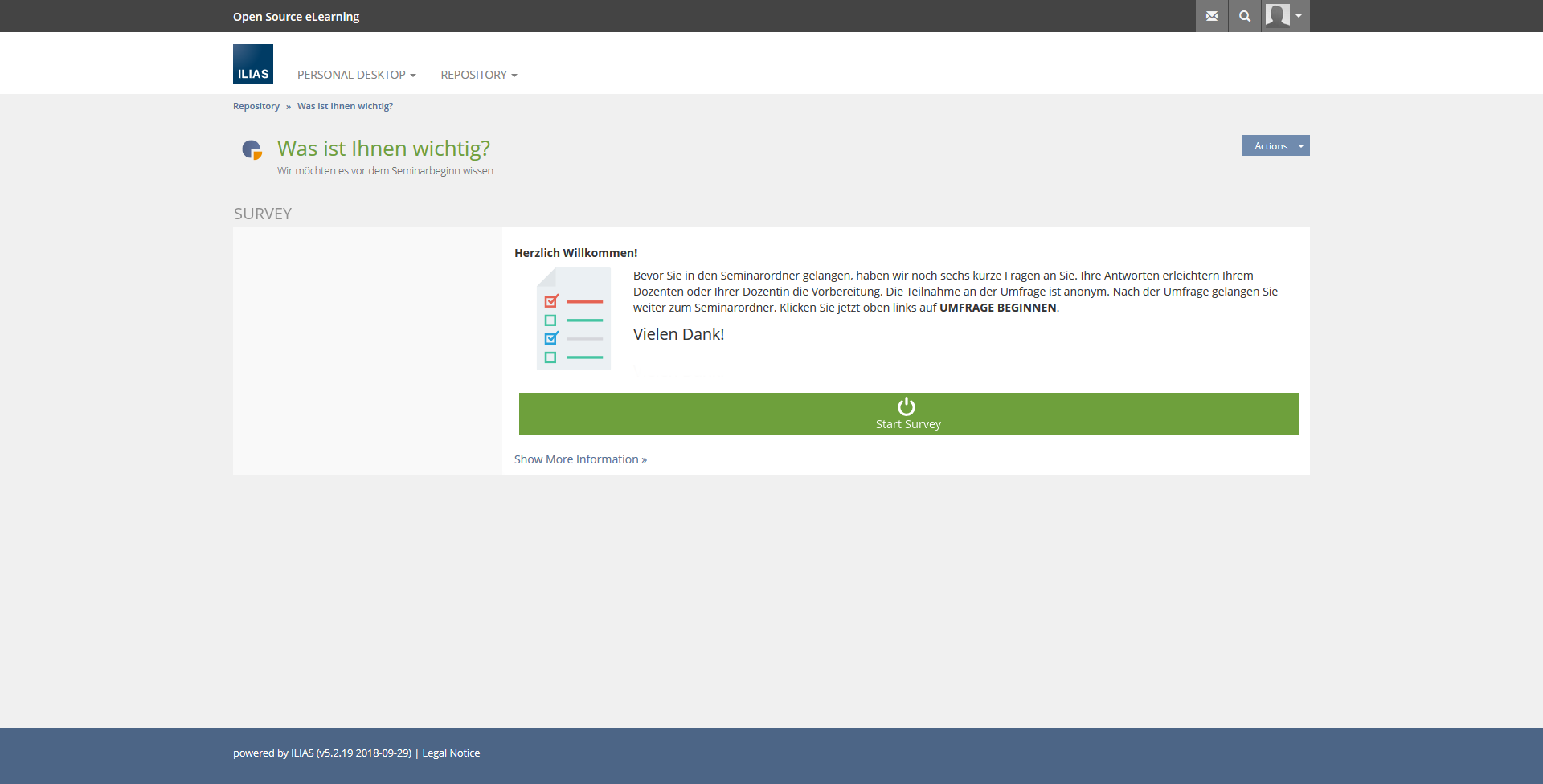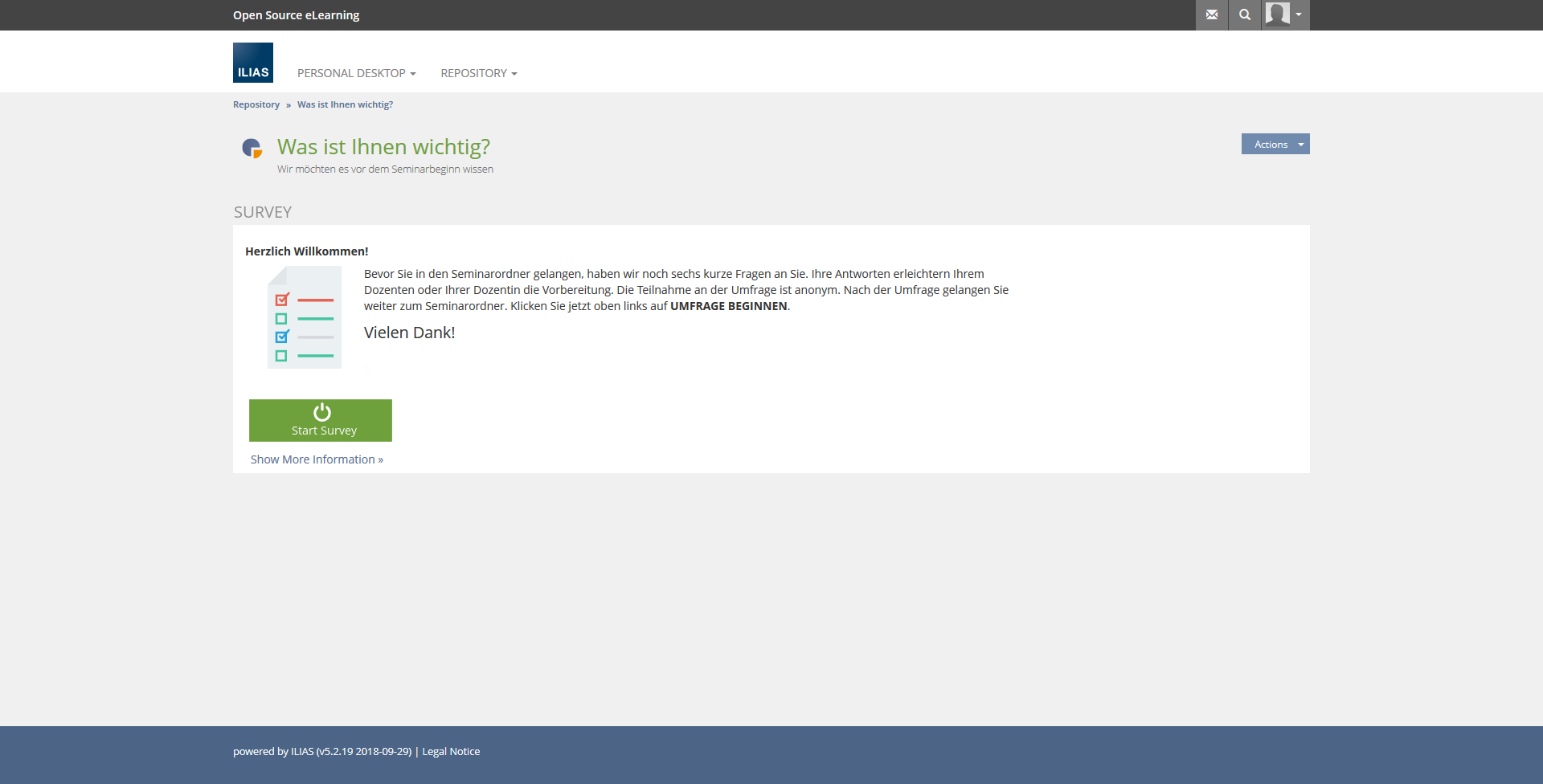 Lauener, Hansjörg [lauener], 20. Nov. 2018. I additional suggest: a) The grey box appears because the first maintainer implemented the start of surveys and tests in the Info-tab. Get rid of this unnecessary empty "grey screen". And b) This bulky button is toooo big for me. I personally think we should only move the current start-button below the introduction-text.