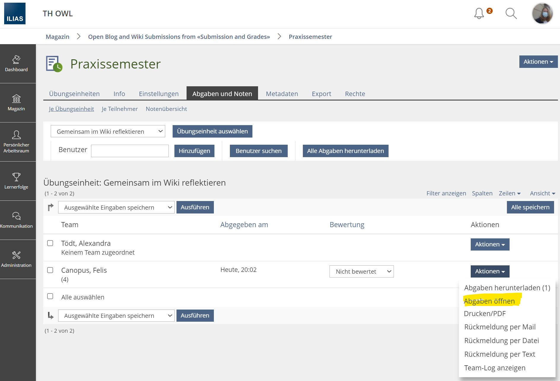 - The table 'Submissions and Grades' gets a new Action 'Open Submission'. This Action is offered in the Multi-Actions below and above the table, too.