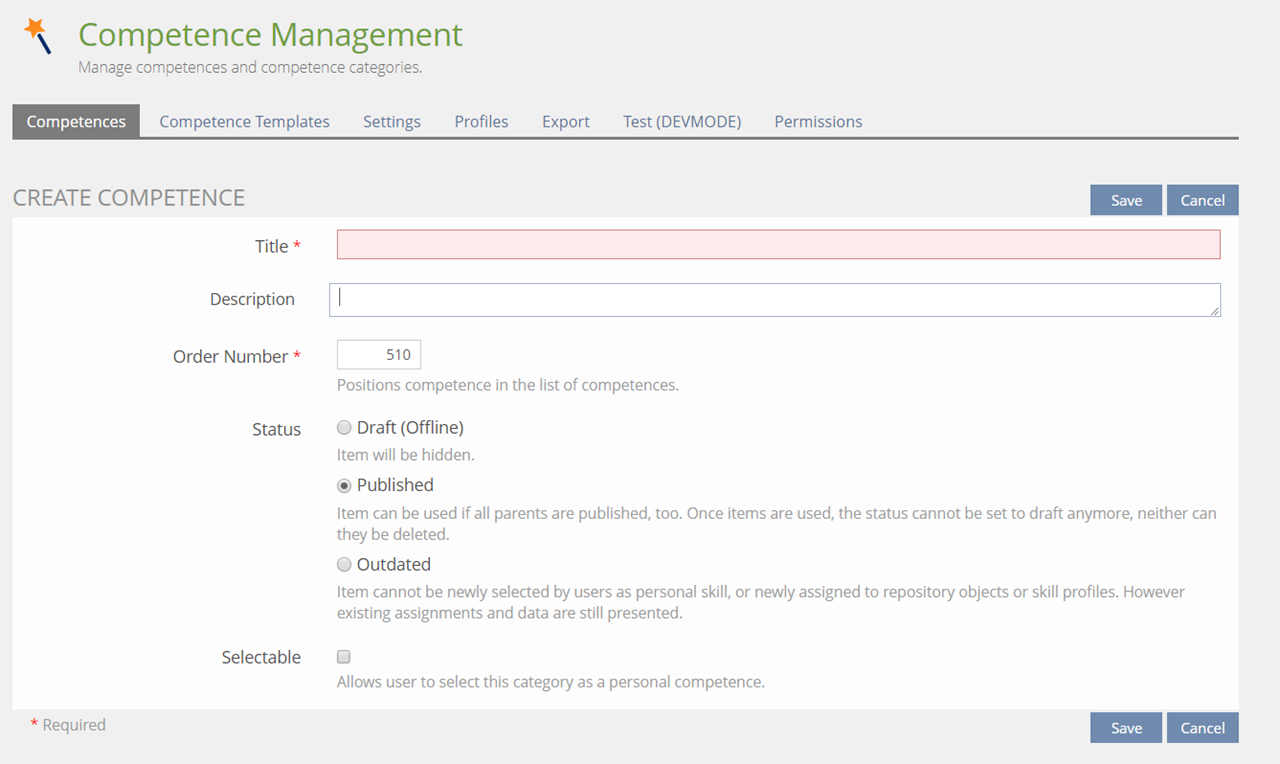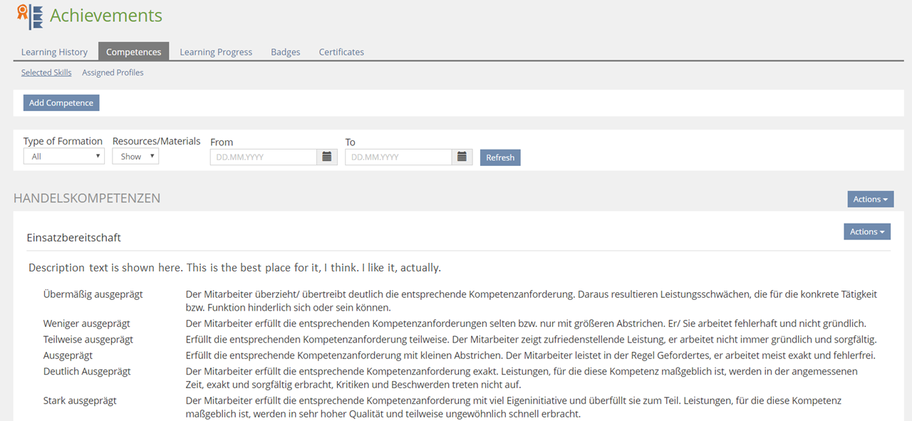 It should be possible to give a description for competecnes and competence categories. Therefore a new text input field "Description" should be introduced.