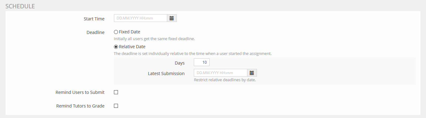 A new subsetting 'Latest Submission' (DD.MM.YYYY HH:mm) is introduced for the relative deadline option. If reached all submissions are blocked, even if a user has not used all of the days given for the exercise. The idea behind this is that students should be allowed to organize themselves by allowing them to choose when to start an assignment, while still being able to have a final date by which all students must have completed their assignments.