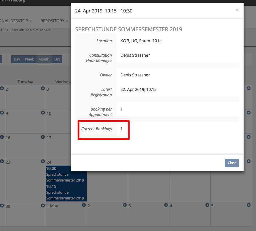Booked consultation hours are displayed in the portfolio if you are either the consultation hour provider or the one who booked the consultation hour. "This is the behaviour since 5.1 and earlier (Statement S.M."