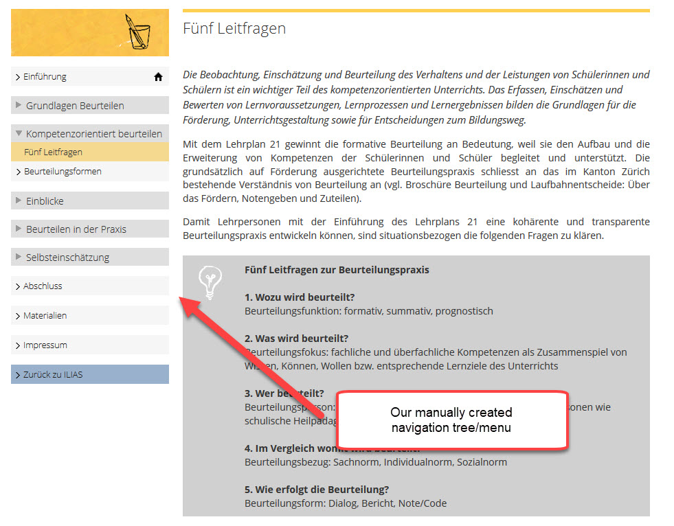 For the big customer we created several learning modules, where we decided to hide the default navigation and manually created a nice customized navigation-tree to satisfy the demand of our customer. Of course to create and maintain such menus manually is very tedious and error-prone.