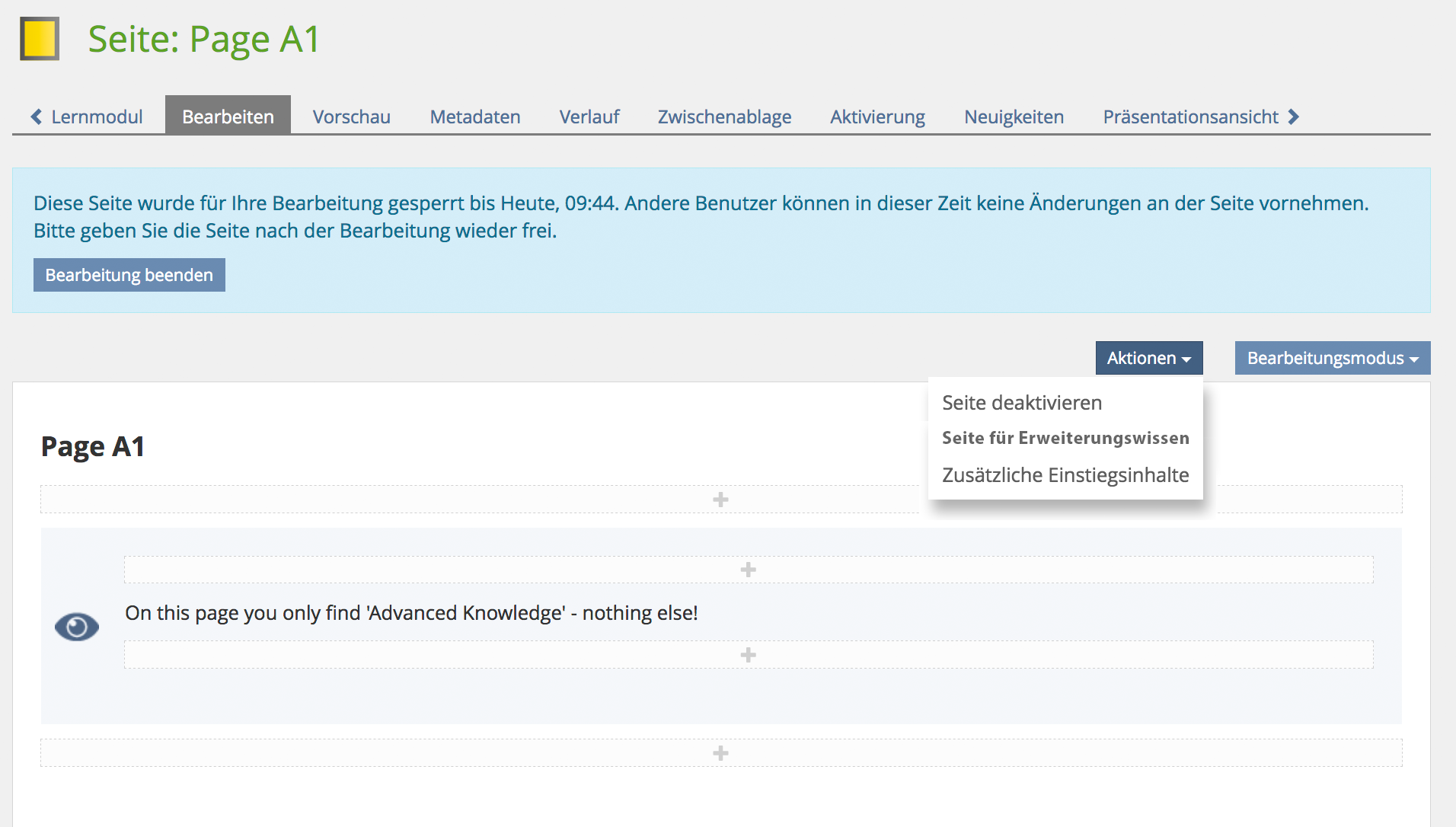 - Action menu entry for Advanced Knowledge: Similar to the workflow of defining a page as 'deactivated', the command to define a page as 'Advanced Knowledge' should be added to the 'Actions' menu of the page editor.