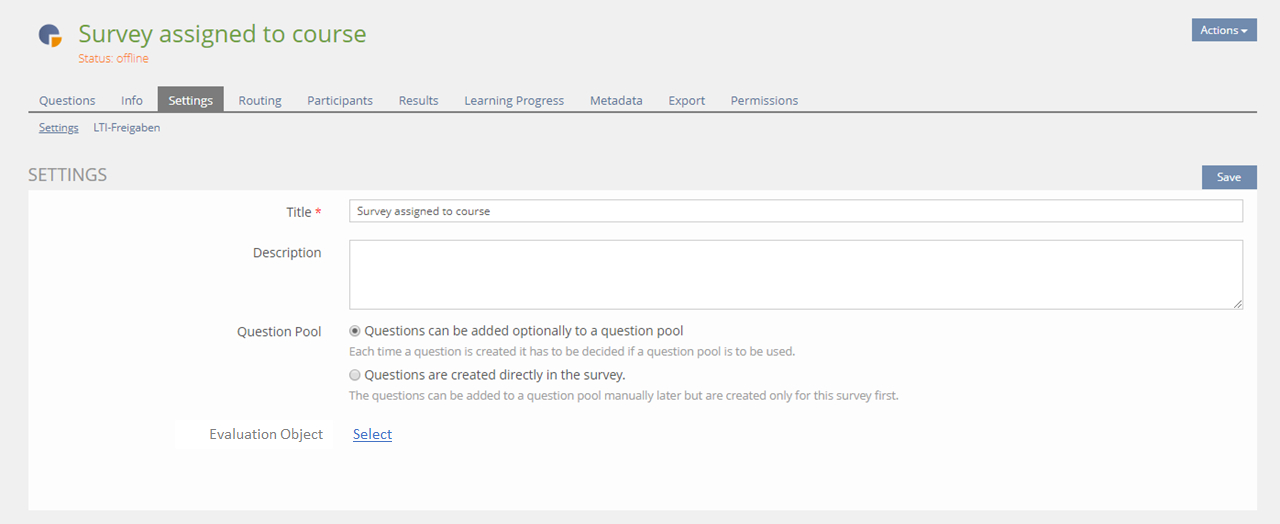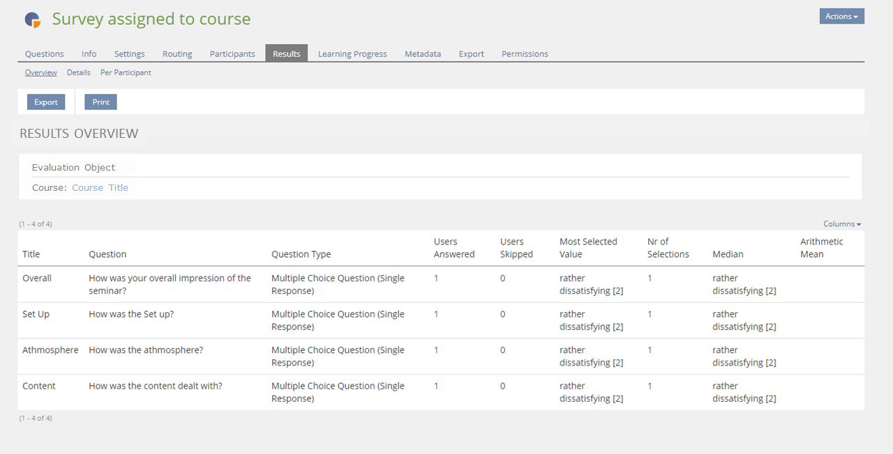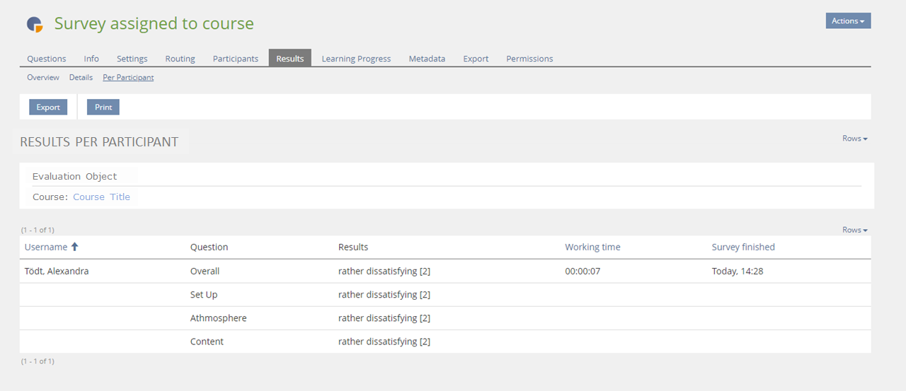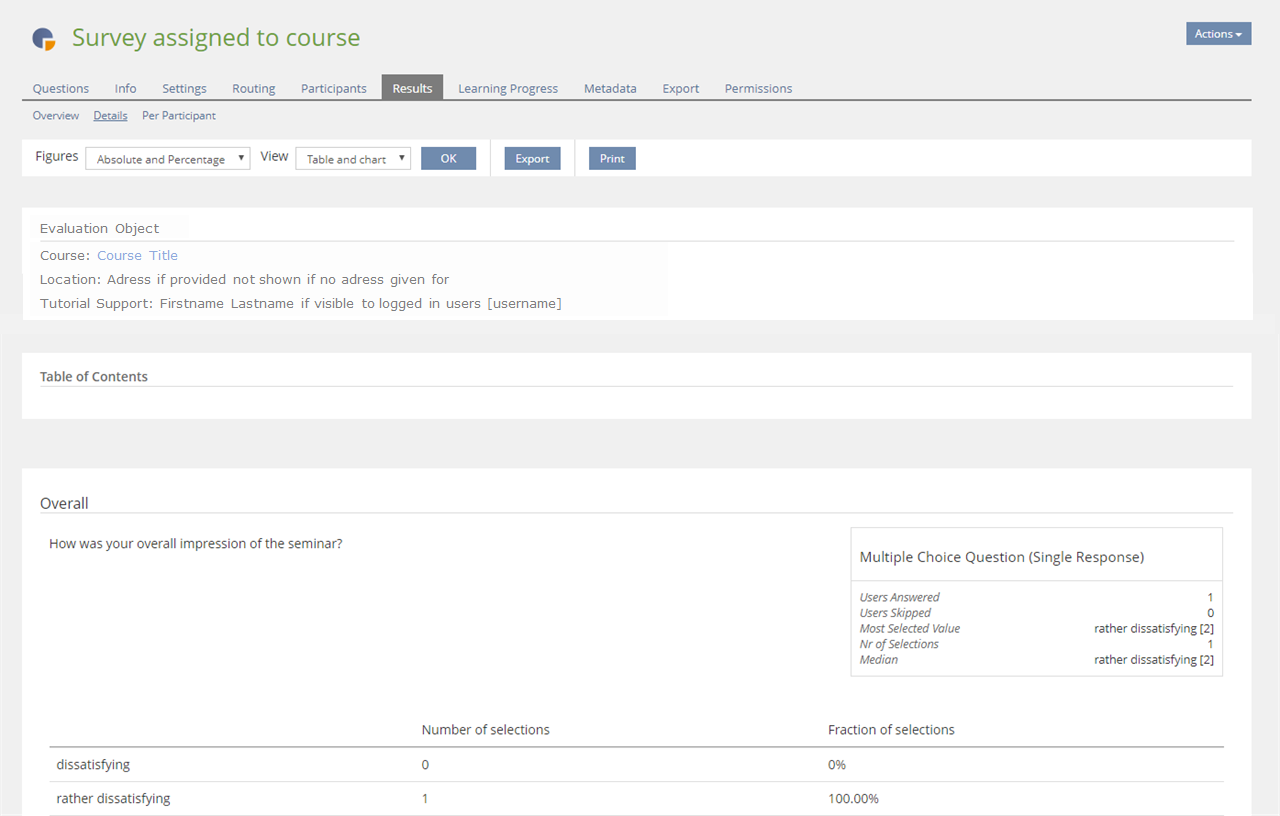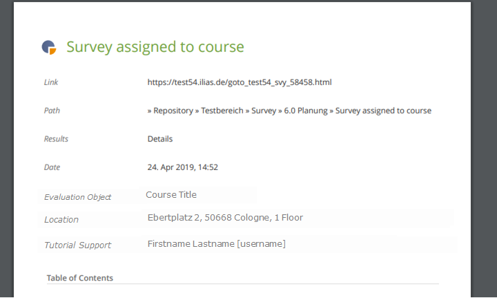 Kunkel, Matthias [mkunkel], 12 AUG 2019 : Thanks for this proposal. Is an assigned survey restricted to one course and cannot exist outside this course or be assigned to a second course (in other words - does this feature has an impact on RBAC)? Or is it more a kind of metadata to show this specific relation between a survey and a course?
