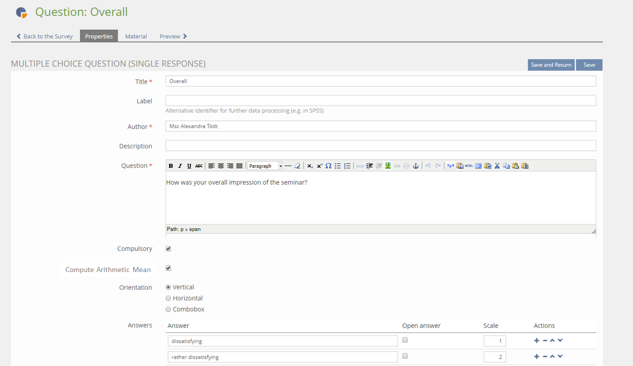 If questions have the measurement level i.e. a Rating or a Likert scale, users should be able to activate a checkbox "Compute Arithmetic Mean".
