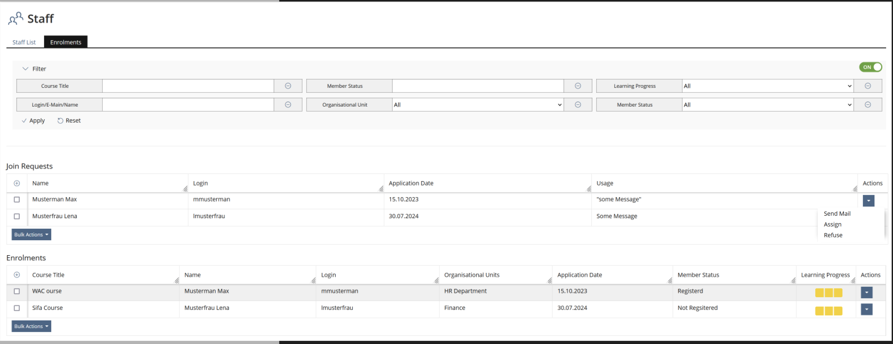 - Superior is presented with the Request in Staff > Enrolments on top of the table.