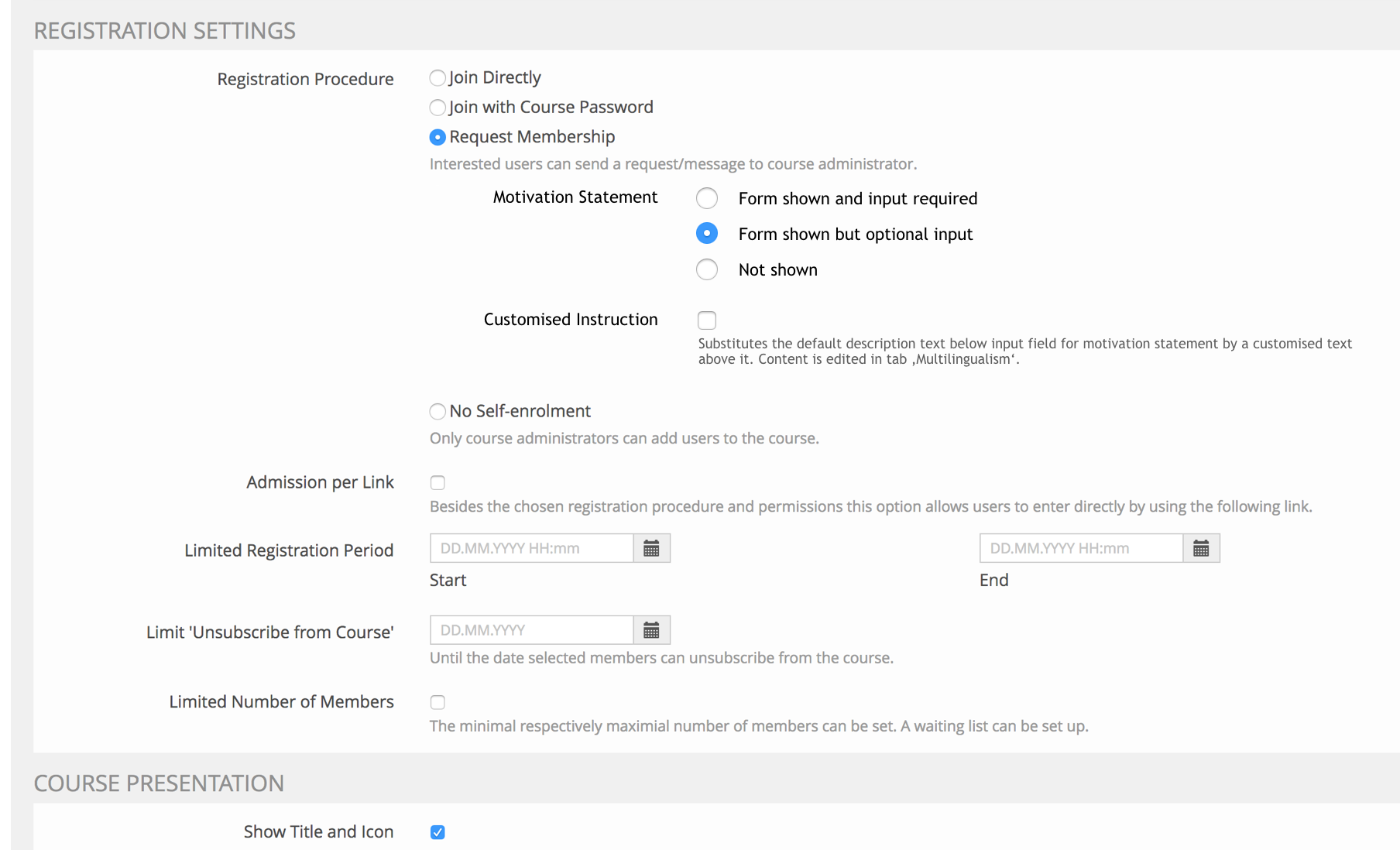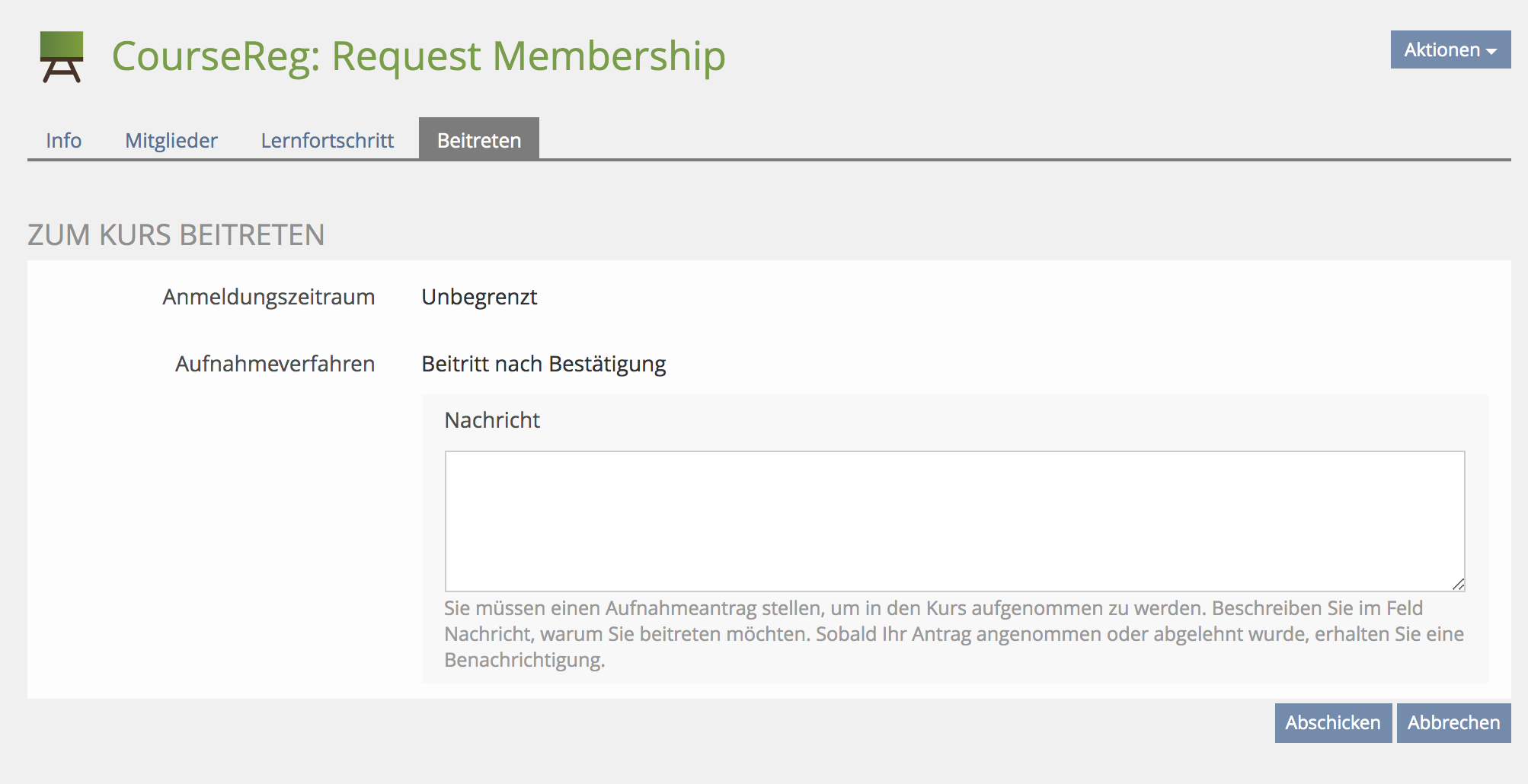 If registration method "Request Membership" is chosen, ILIAS offers a text input to users who want to join a course or group. The text entered by an applying user is presented after submission to course / group admins on the list of membership requests. They then could decide to accept or refuse a membership.