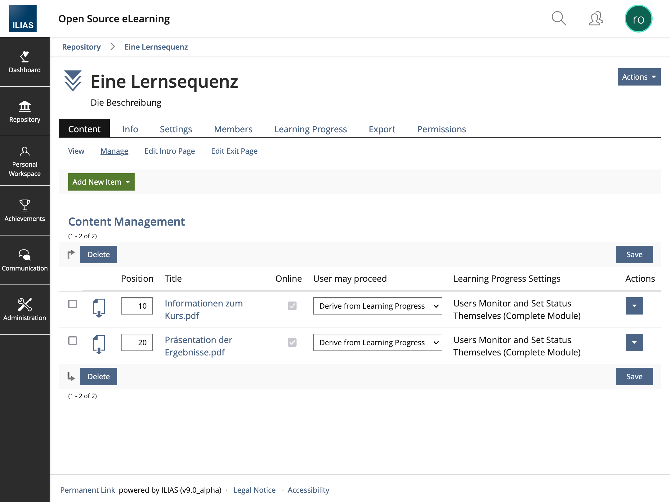 - if "user may proceed" is set to "learning progress", the user can click on next after clicking on "Set completed" first