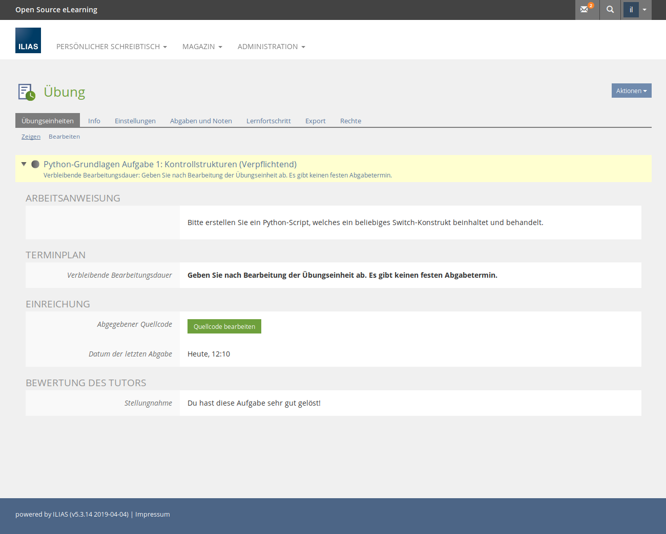 Student Simon is interested in scripting languages and would like to prepare for the corresponding exam. He calls up Prof. Stefanie's exercise unit and edits the current exercise unit "Python - Control Structures", then submits his source code. Shortly after the submission Simon can see the result in the exercise.