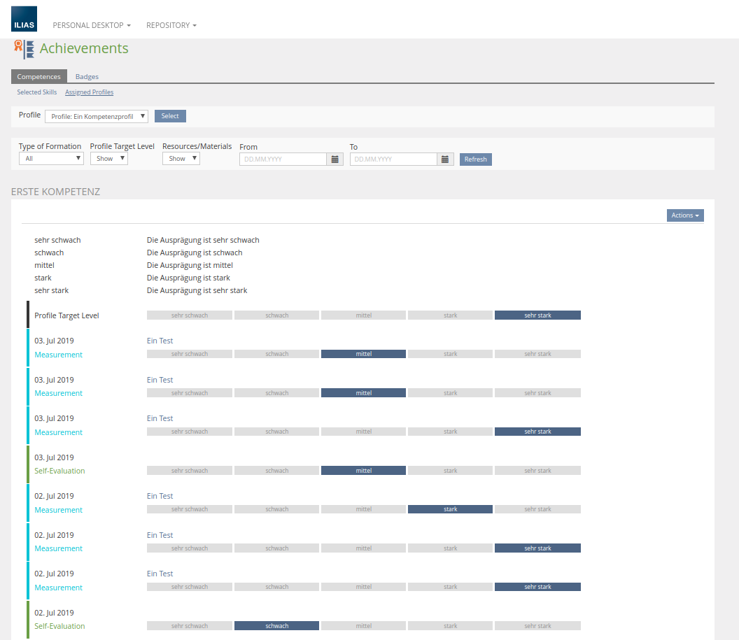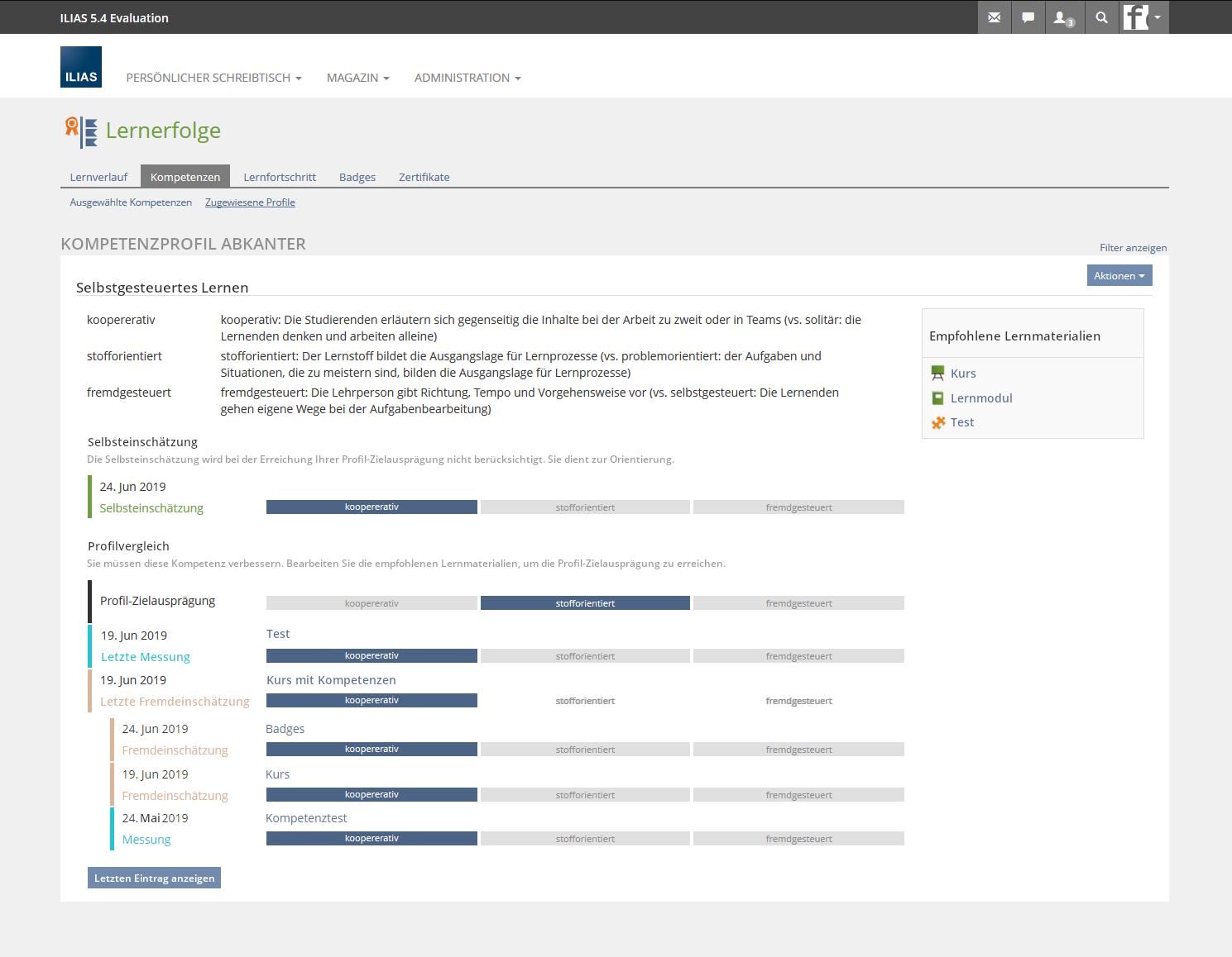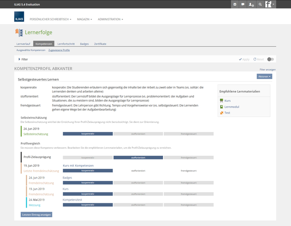This request implies changing the behavior to achieve the profil target level. The last entry in competence management should determine the achievement of the profil target level. In this way, the proposed learning content is always adapted to the current status of the learner.