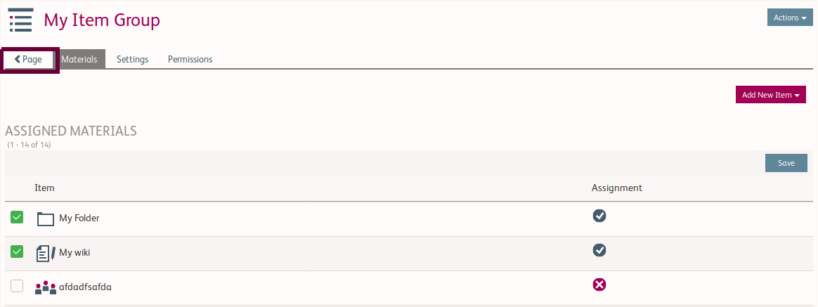 When selecting "Create New Item Group" then existing sequence of views for creating an Item Group is used. Once the Item Group is created the usual link back to the Course is replaced by a link to the Page.