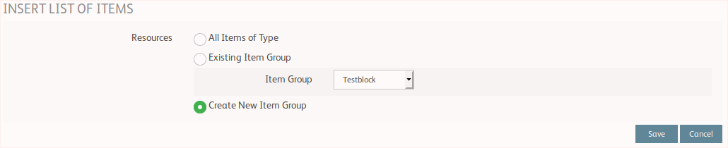 - The dialog "Insert Resource List" is expanded by one option "Create new Item Group"