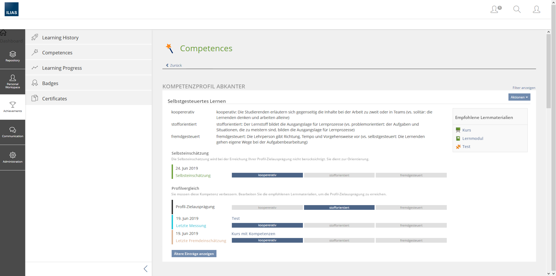 JourFixe, ILIAS [jourfixe], 20 JAN 2020 : We discussed if the 'Presentation Table' could be a better way to implement this presentation of competence profiles. Enrico will check this and present the request again at the next JF.