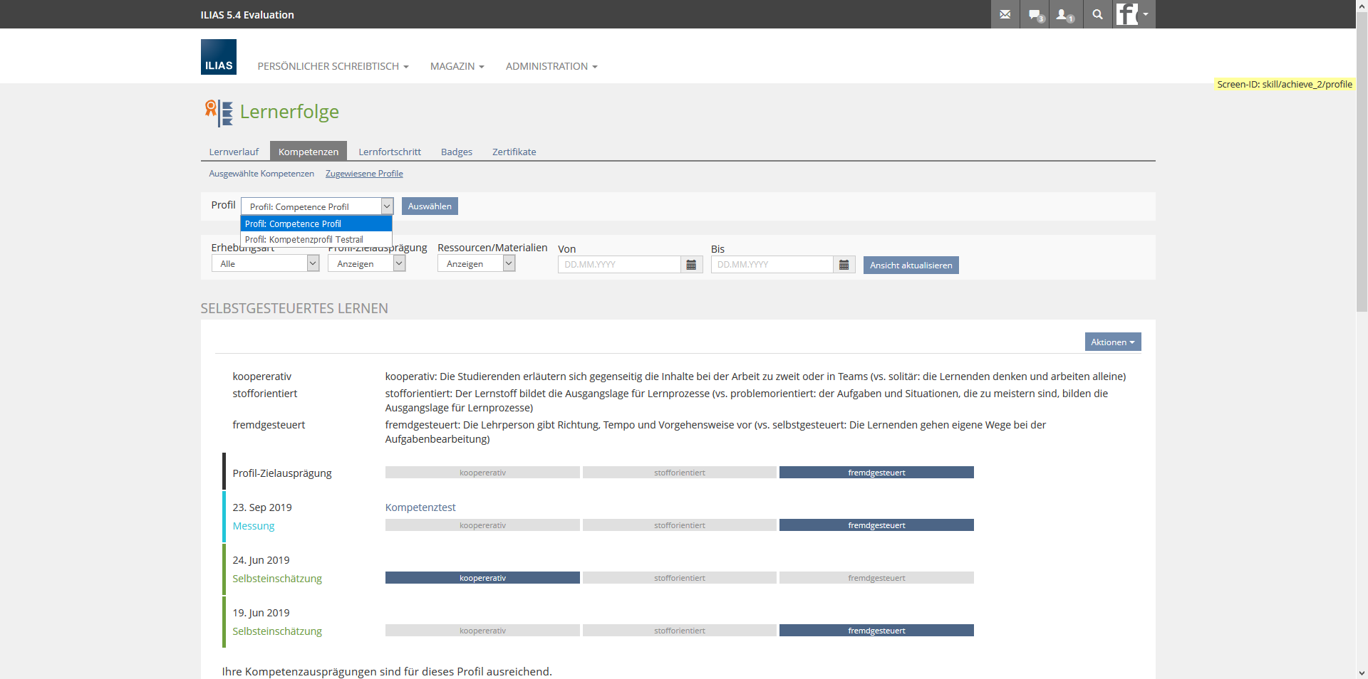 In ILIAS 6.0, users can switch between competence profiles via a selection menu at the top of the page. This selection menu is often overlooked by users. It is not obvious to users that several competence profiles have been assigned to them.