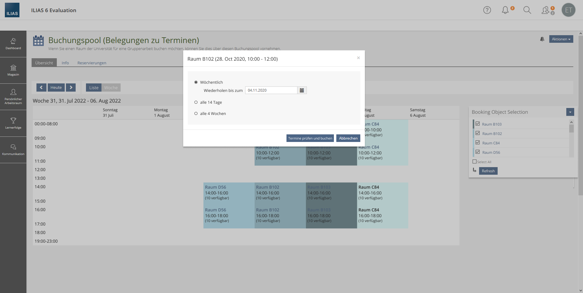 - If users want to book several repetitions, they can enter the interval of the repetition in the second step of the booking. By clicking on the button "Check and book dates" ILIAS checks if all repeat dates are available.