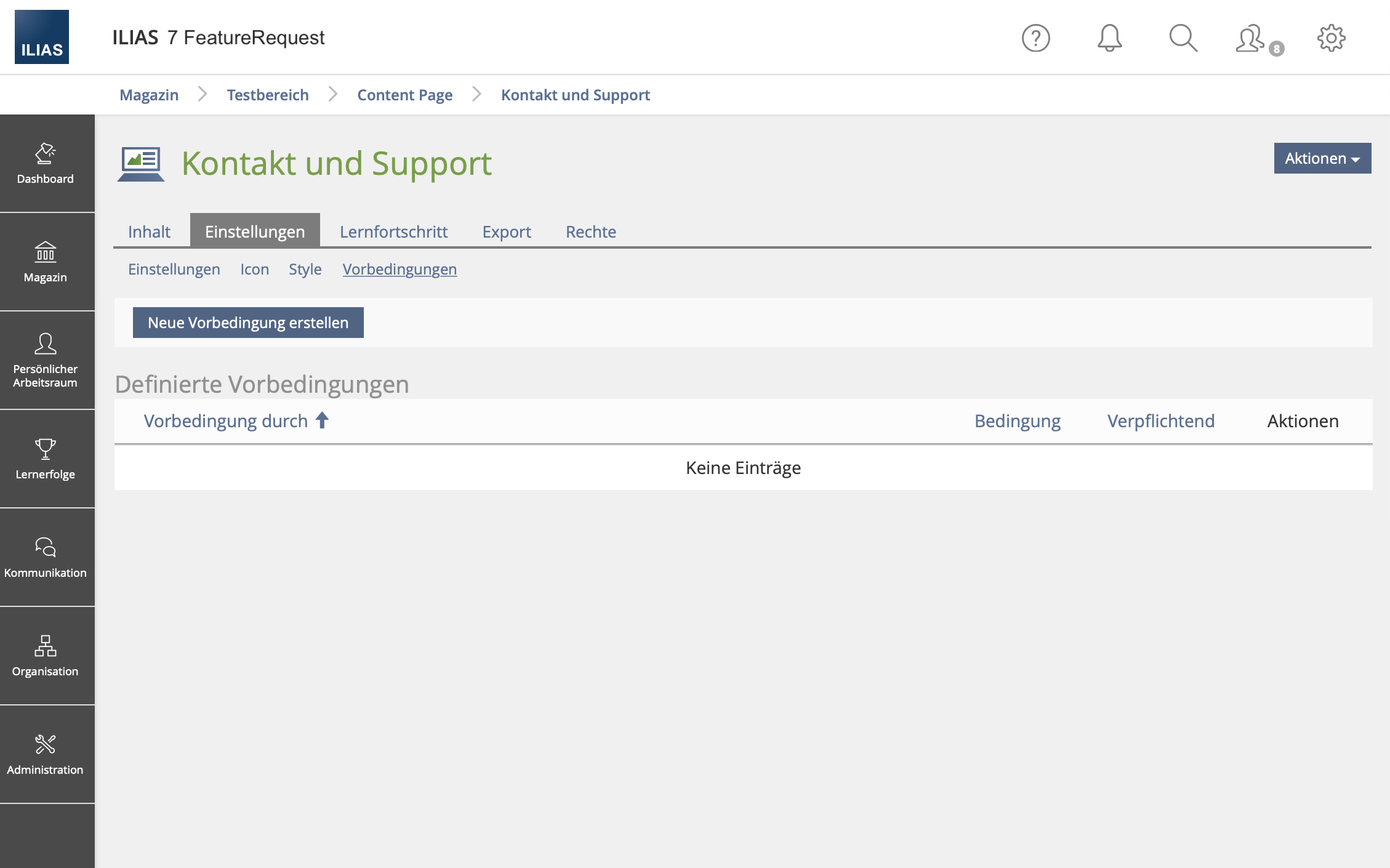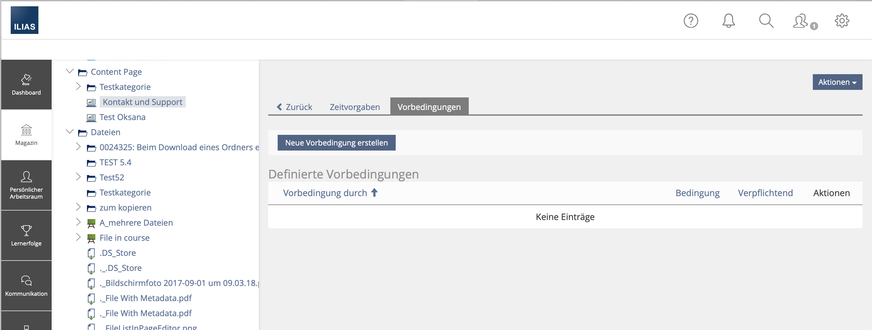 - Workflow would be: Open Tab 'Content', Subtab 'Preconditions' >> Button ‘Create new precondition’ >> Select the object that should receive a precondition (must be within the container) >> Select the object that is to be the precondition (can also be outside the container) >> Define conditions (Passed / Completed / Fulfill all preconditions etc.) >> 'Save'