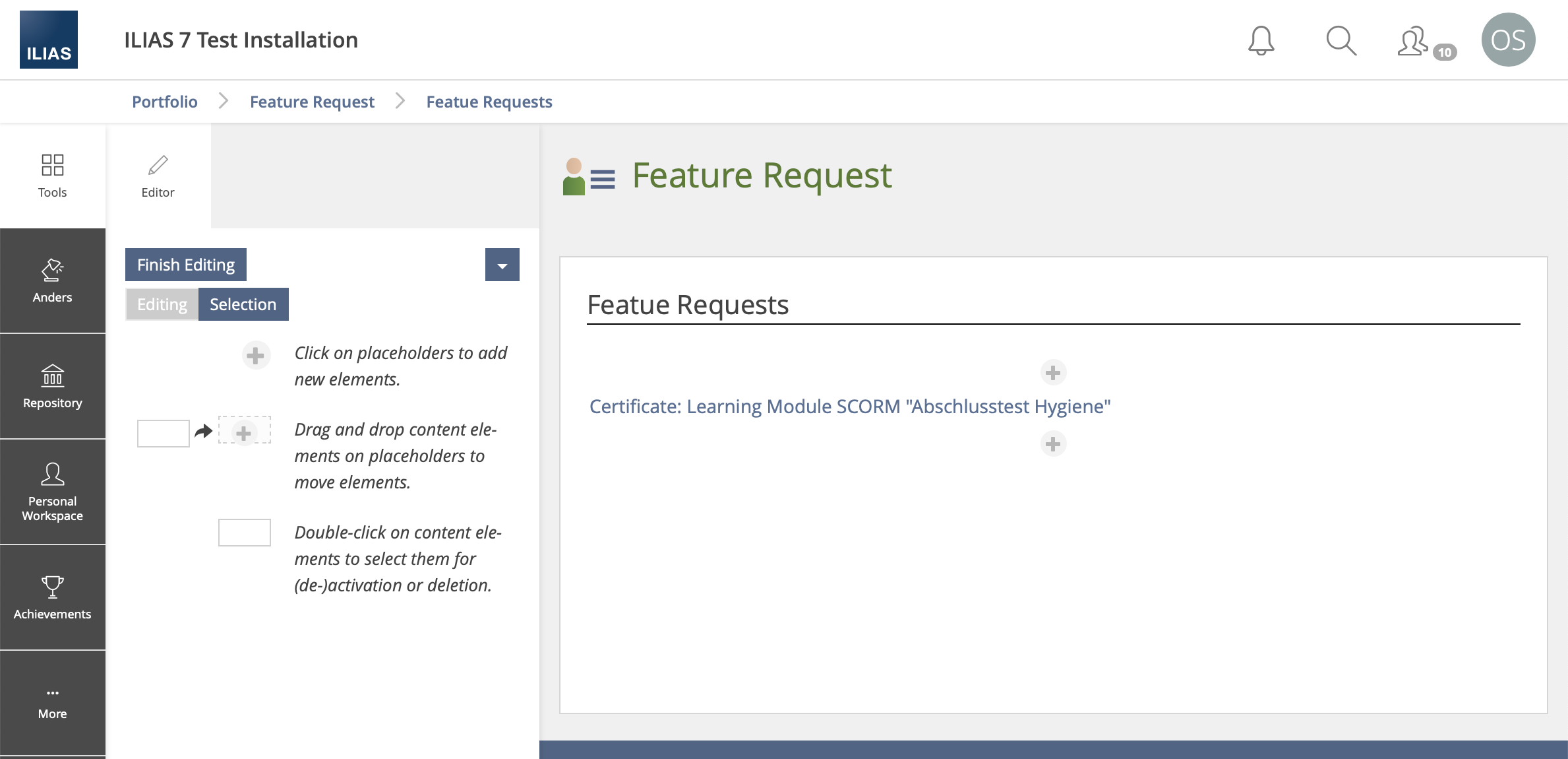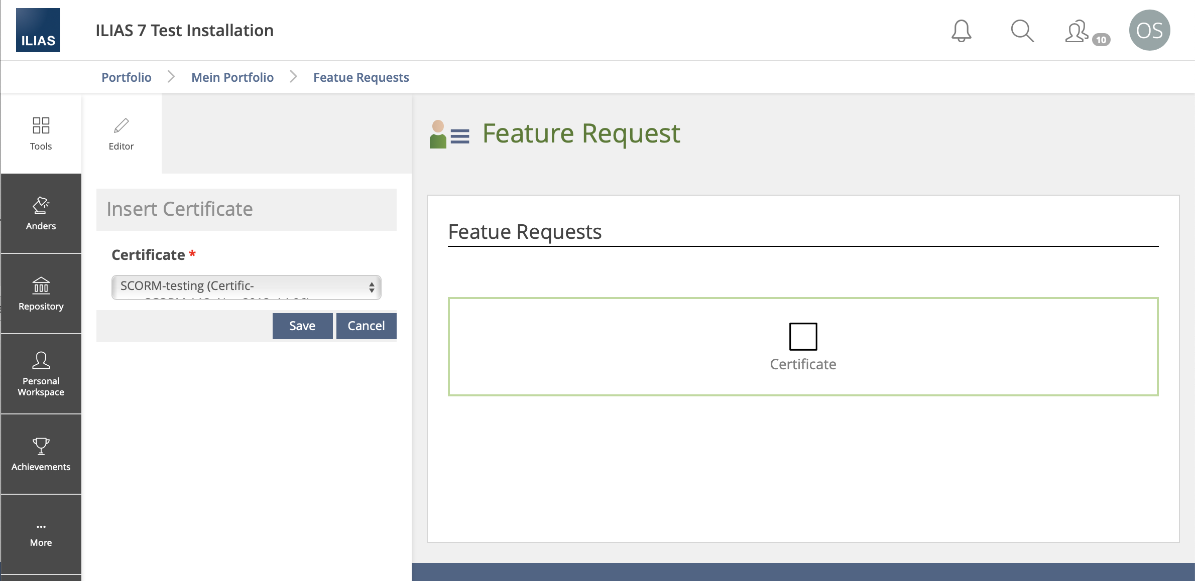 - ILIAS presents Page Element Certificate in Main Area (contains the selected certificate as a link.)