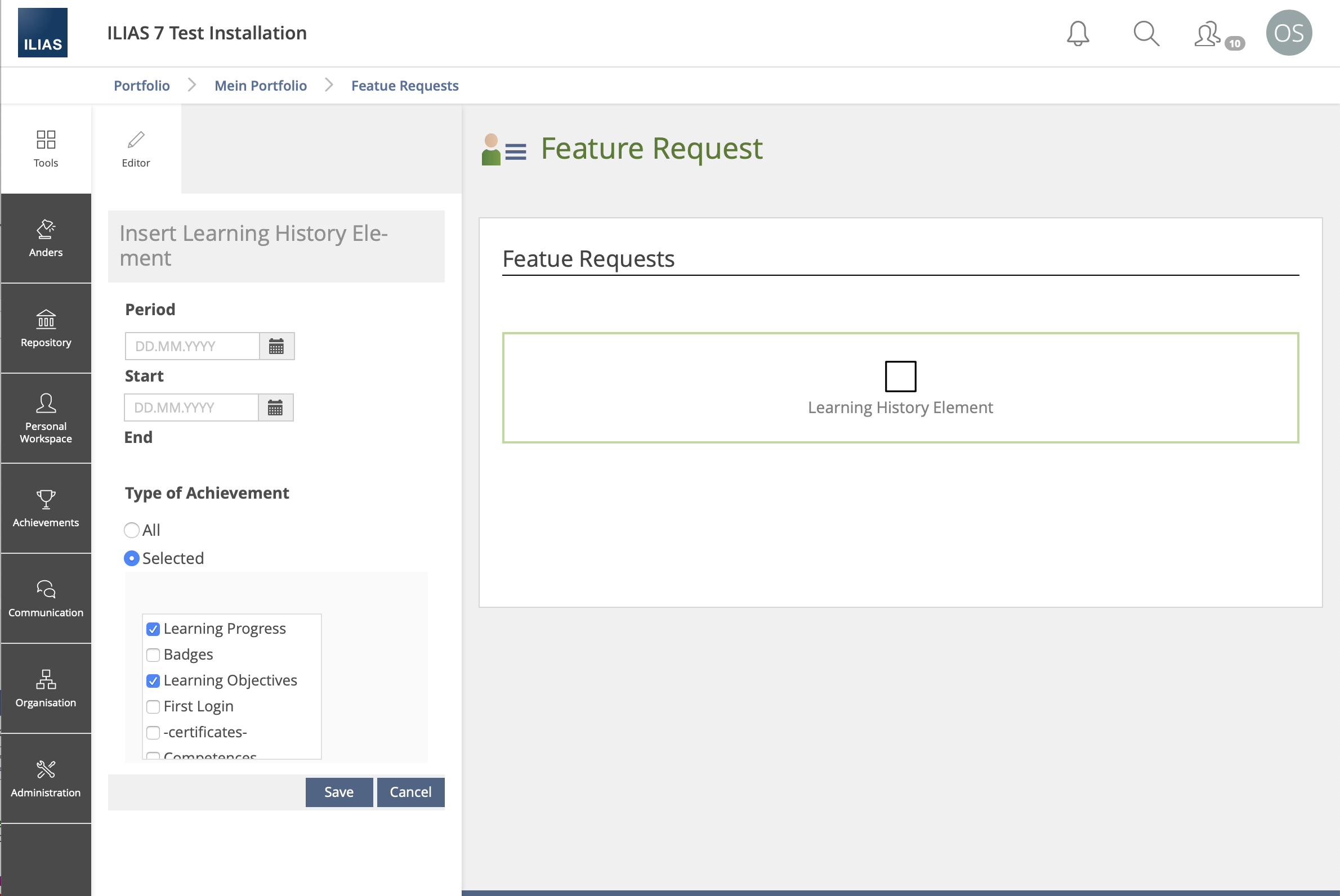 - ILIAS presents a Form in Slate. (In Content Area a Representation of Page Element is shown.)