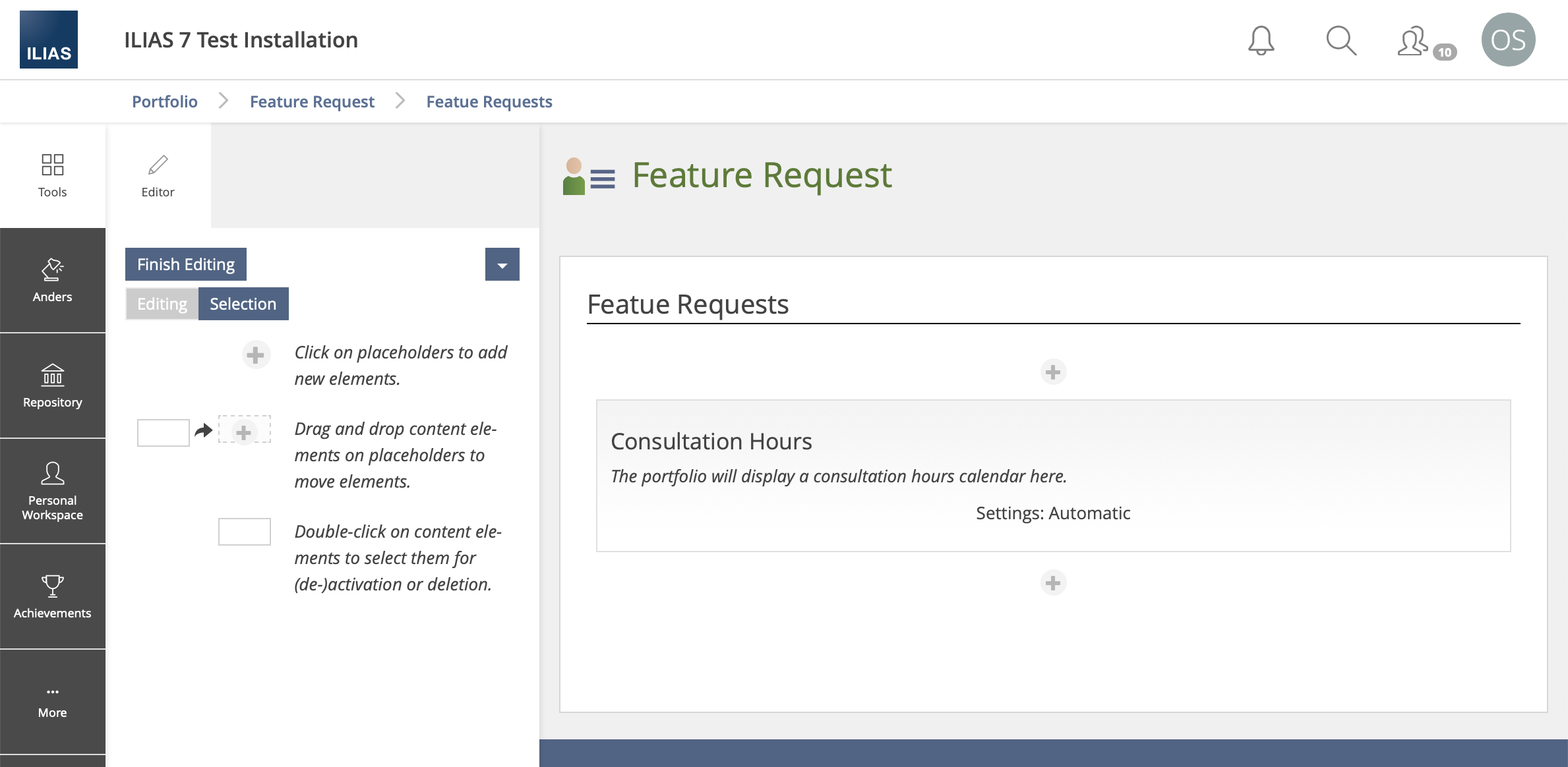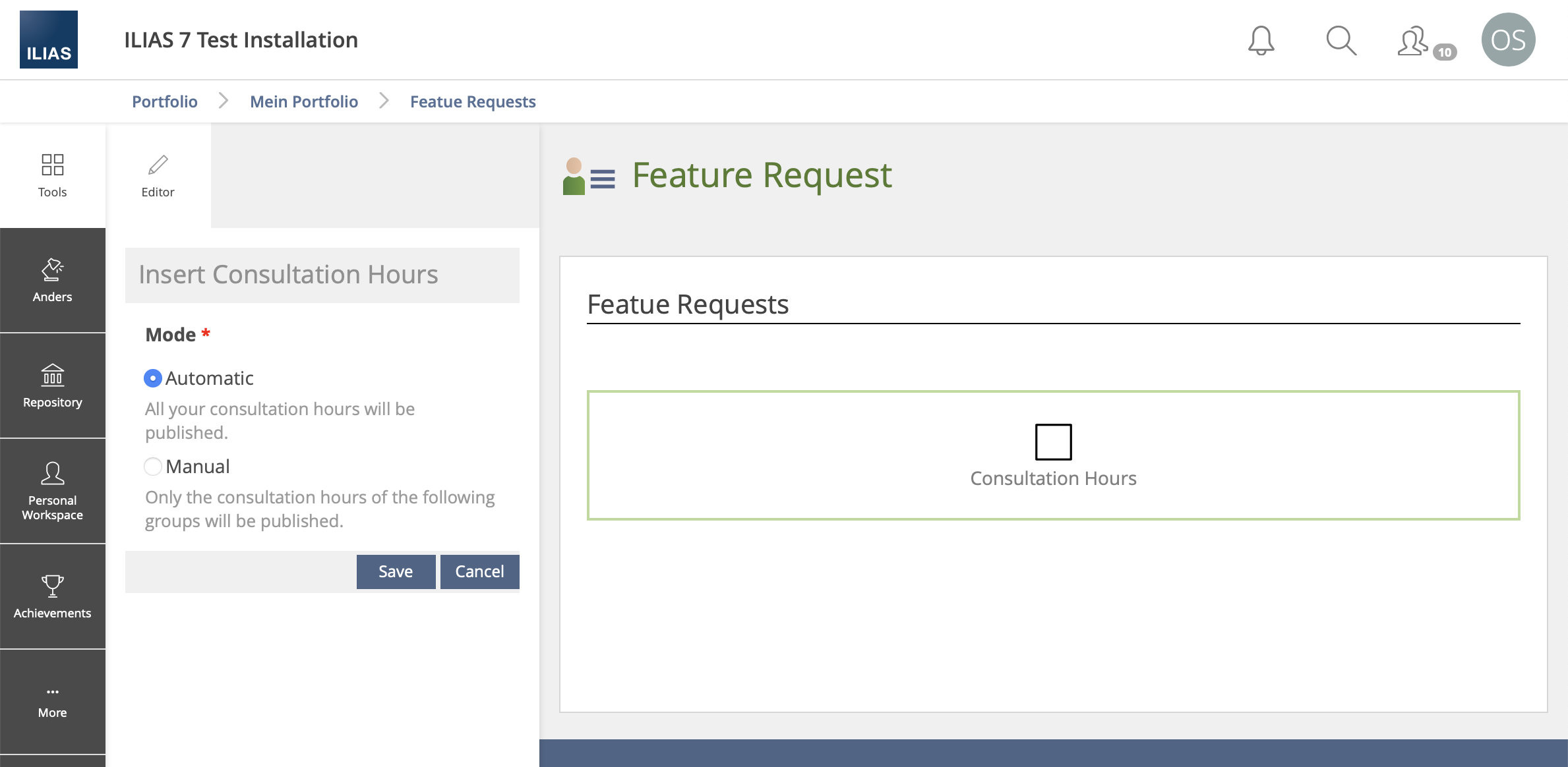 - ILIAS presents a visual placeholder "Consulation Hours [...] Settings: automatic|manual" (No WYSIWYG-Element).