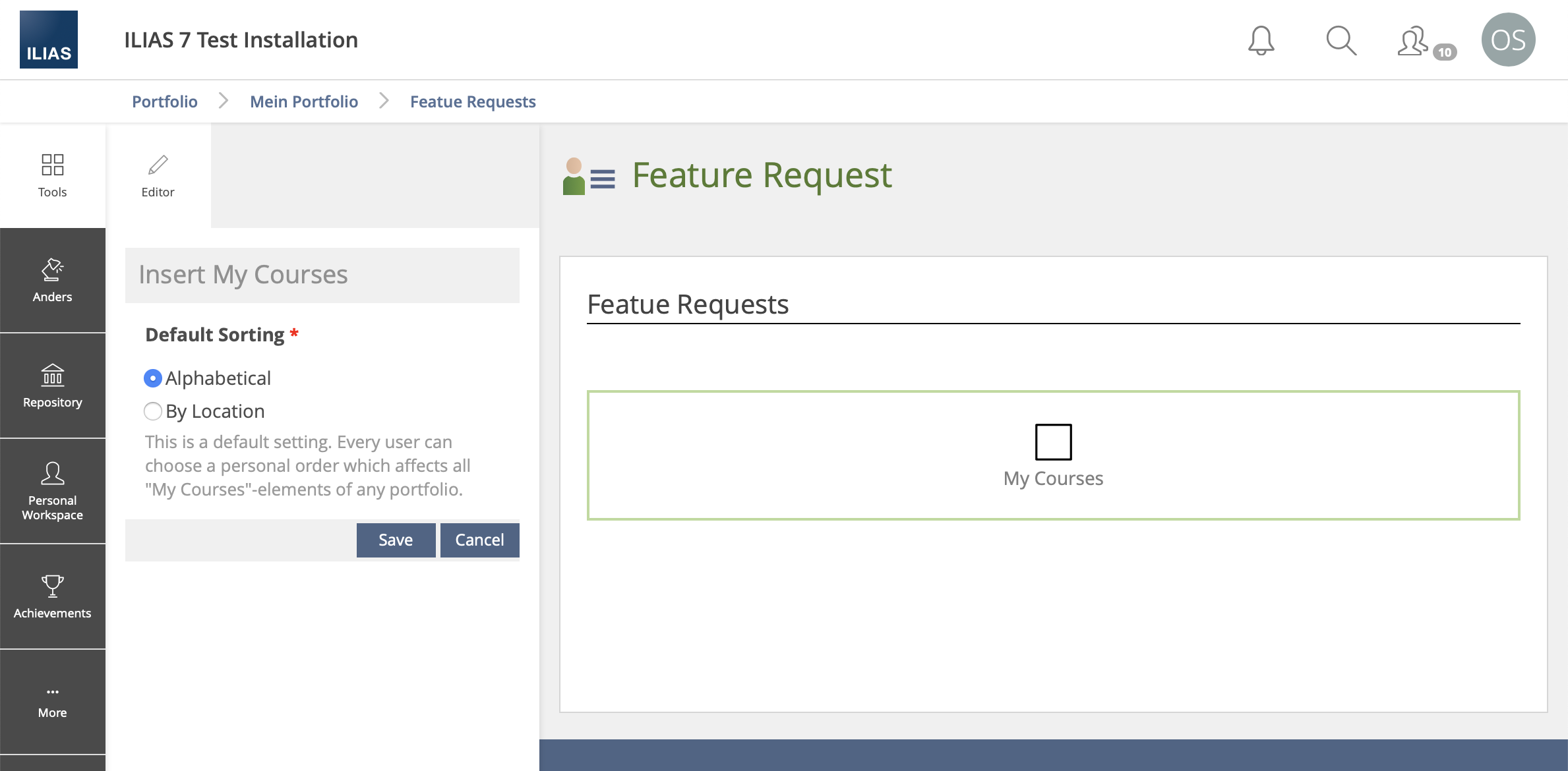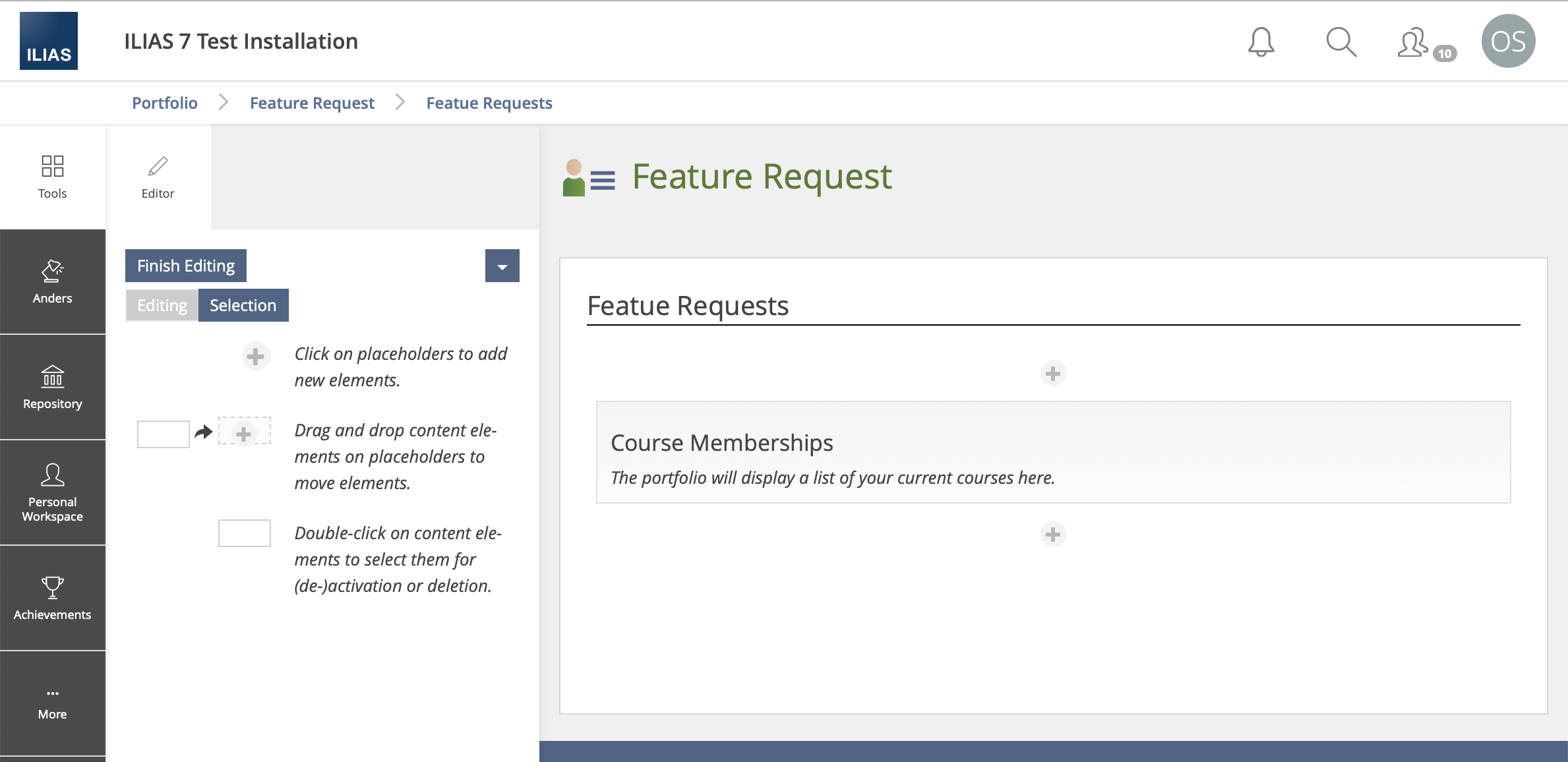 - ILIAS presents a visual placeholder "Course Memberships" (No WYSIWYG-Element).