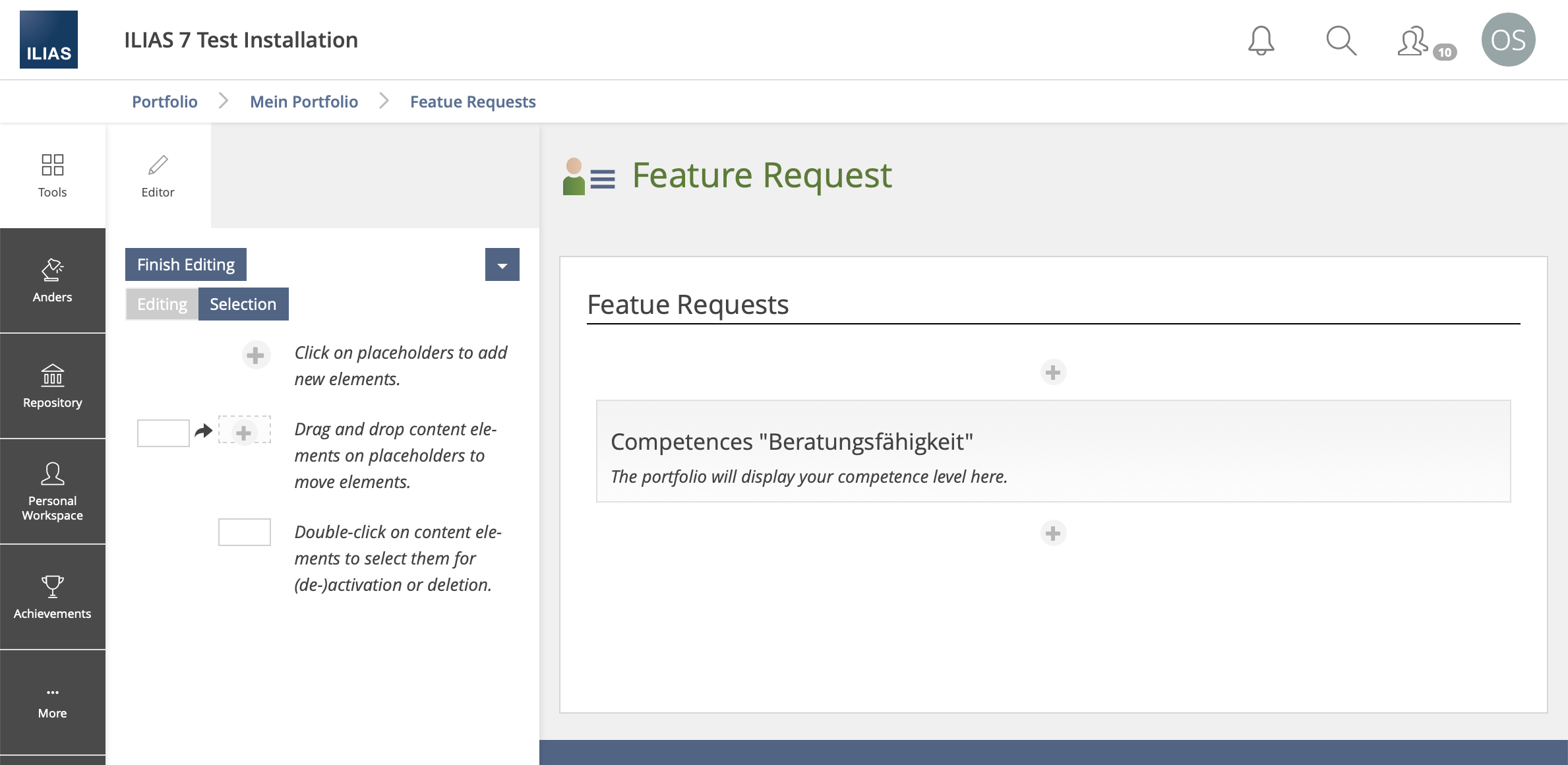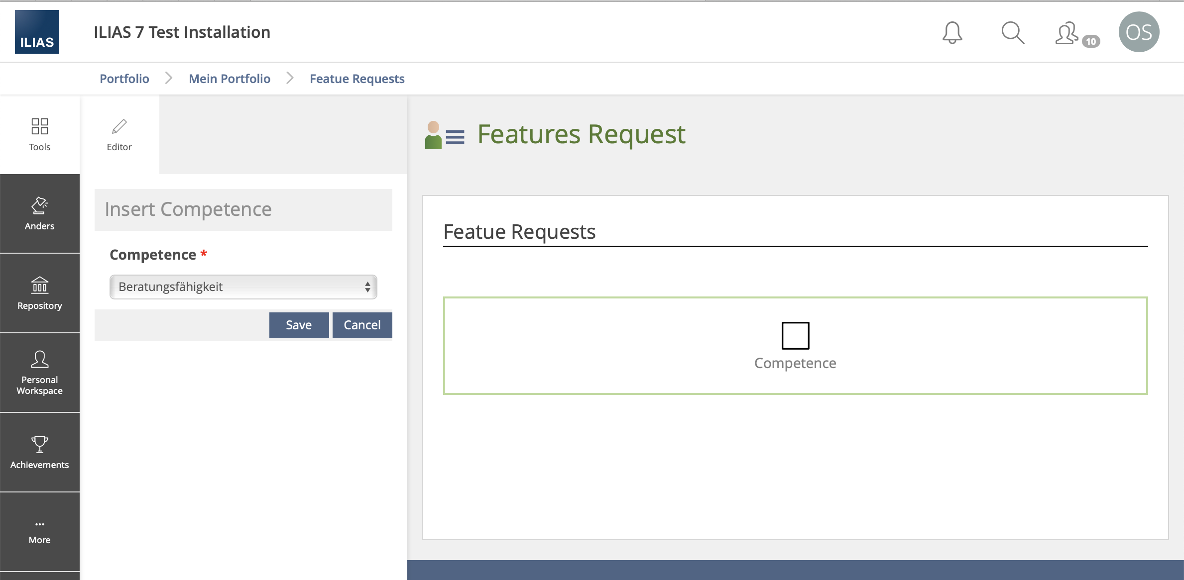 - ILIAS presents a visual placeholder "Competences [Competence Title]" (No WYSIWYG-Element).