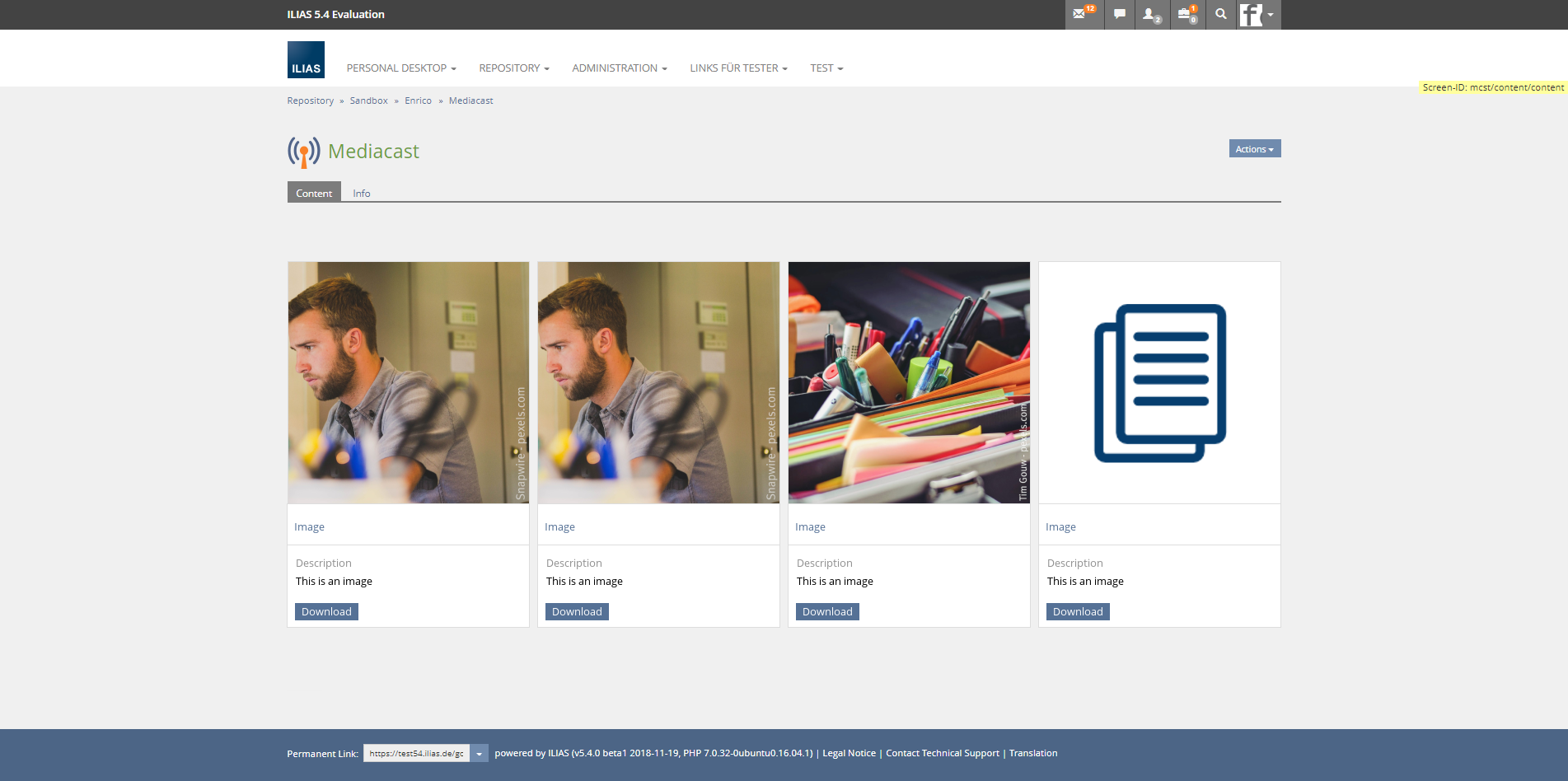 - Media objects in the tab "Content>>View" should be displayed using the Kitchensink UI element Deck of Cards. A Card shows the title, description and a download button.
