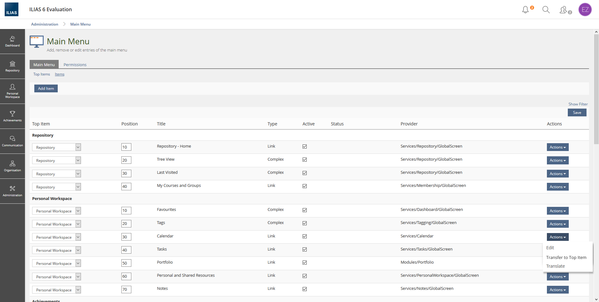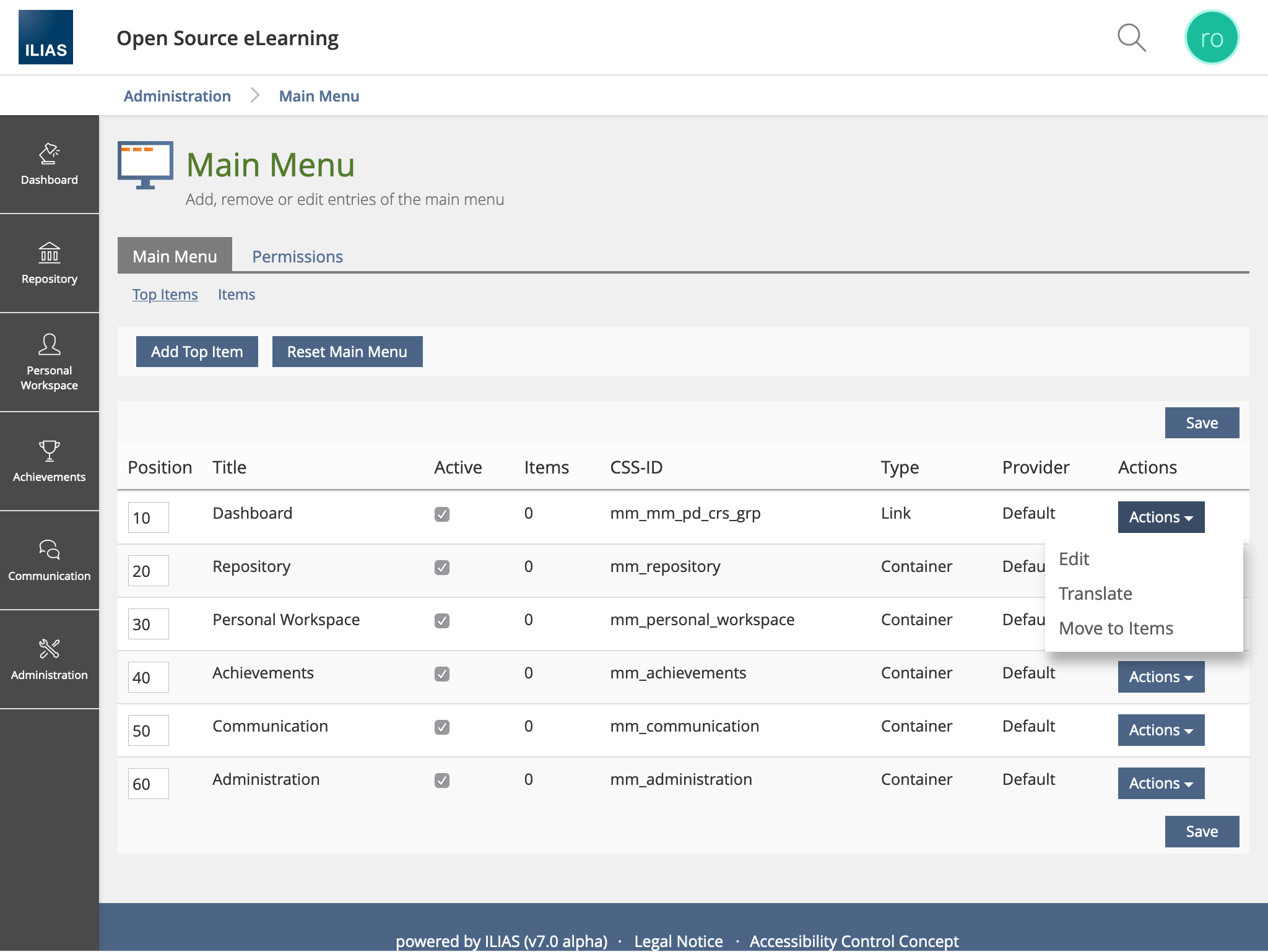 - Administration > Layout and Navigation > Main Menu > Items