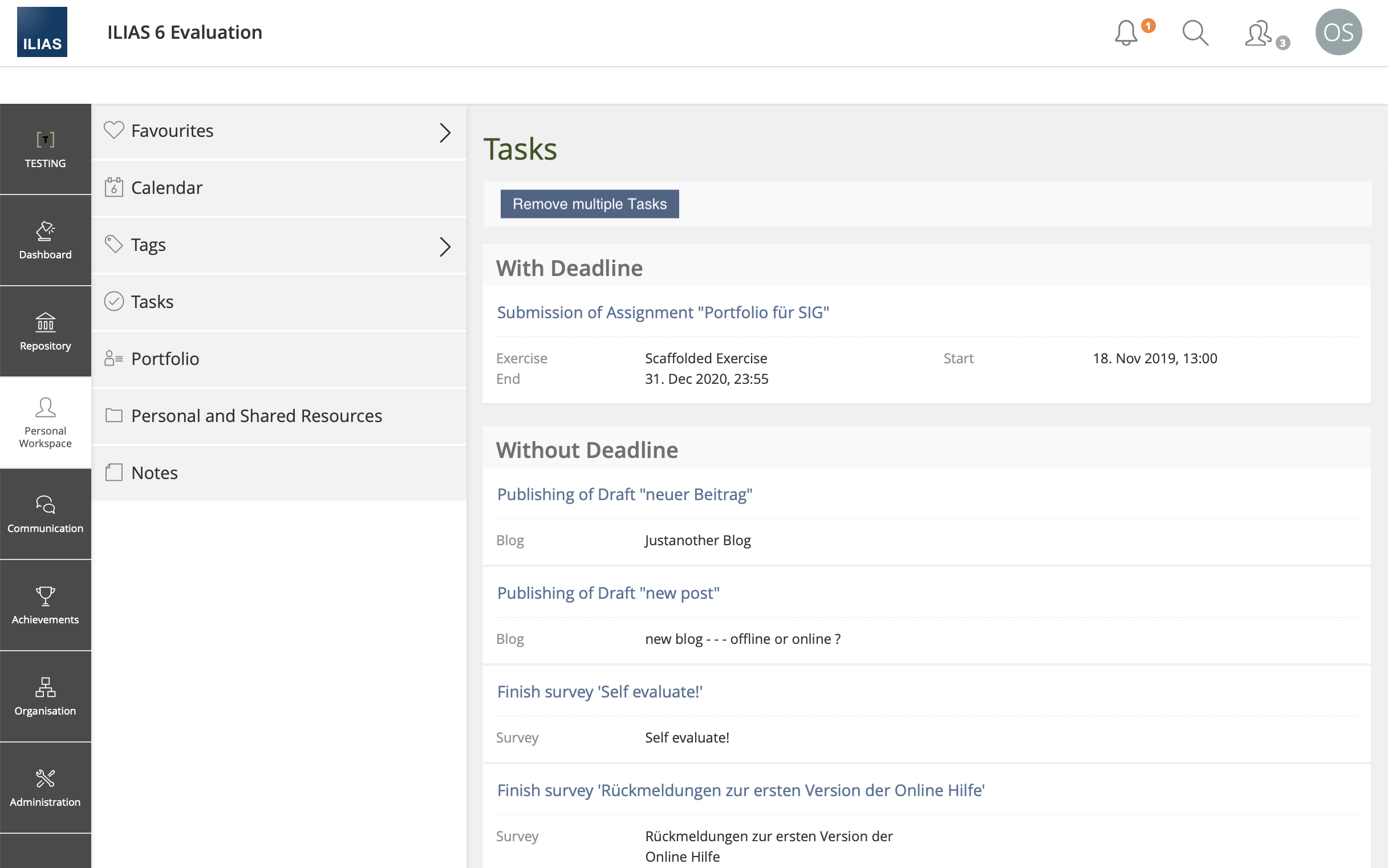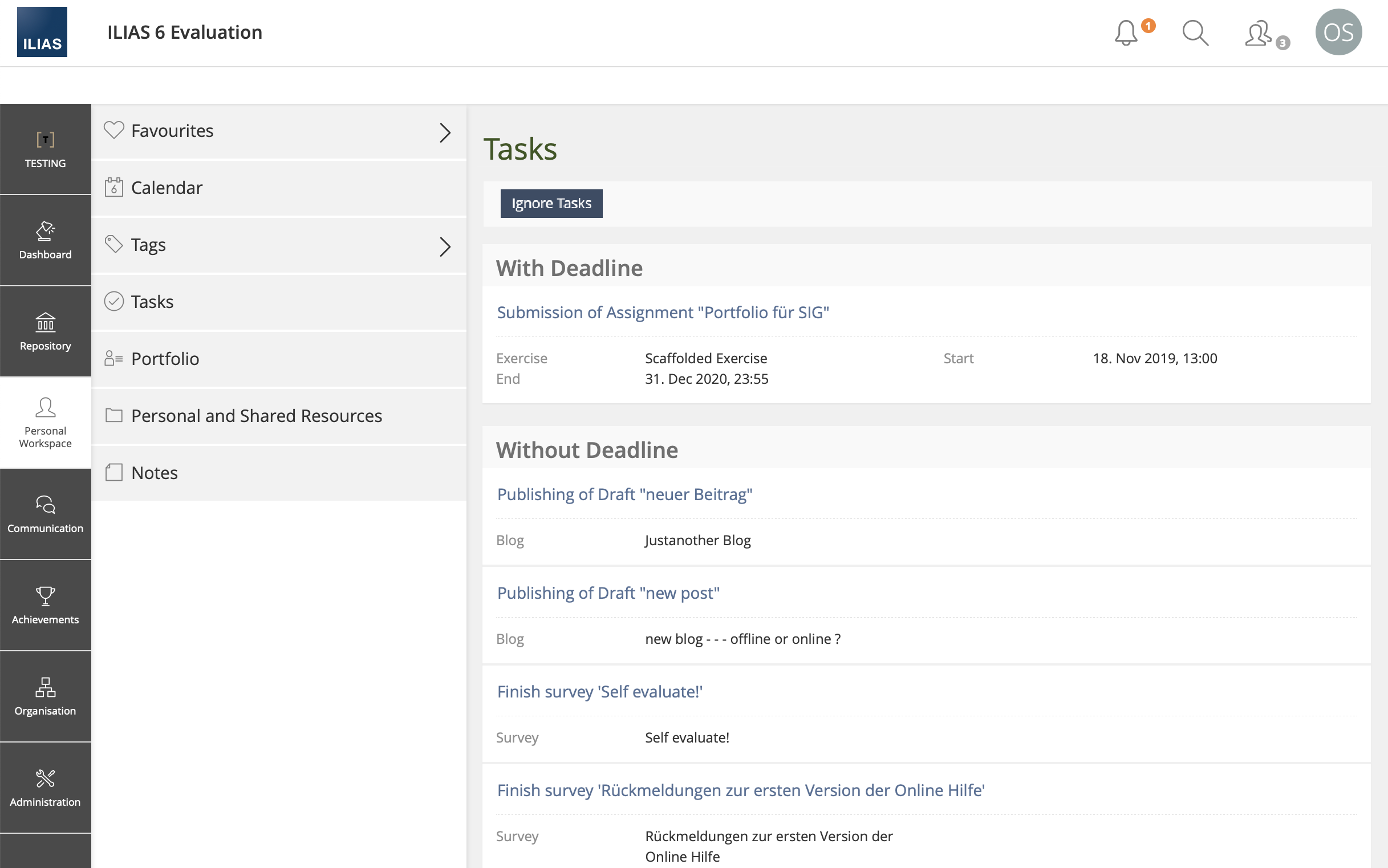 In ILIAS 7 tasks of a user are presented in 'Personal Workspace » Tasks' and on the dashboard. There are tasks with end date and those without date (undated). A few components (Exercise, Survey, Forum, ...) are able to put tasks on a user's task list. But the user himself has no option to remove them from the task list. This leads to never ending tasks in the task list, if there is no end date.