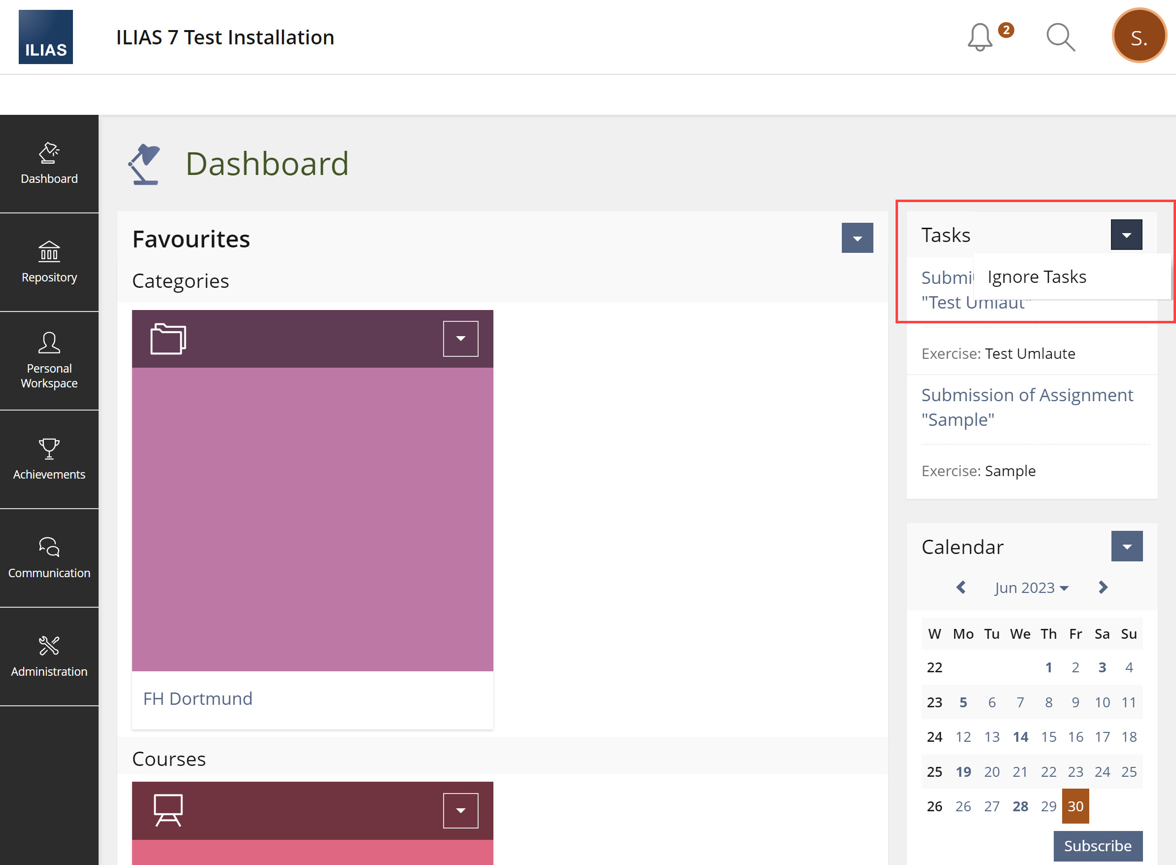 After Ignoring Tasks, ILIAS shows a Success Message at the screen Tasks or at the Dasboard, depending on where the modal was opened.