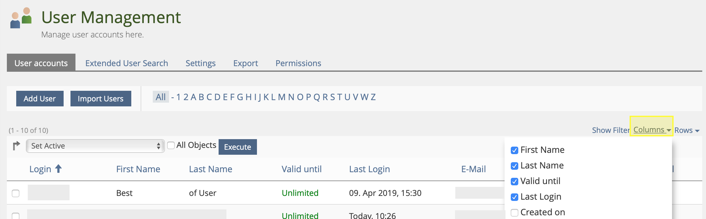 - Administration > Users and Roles > User Management > Tab "User Accounts"
