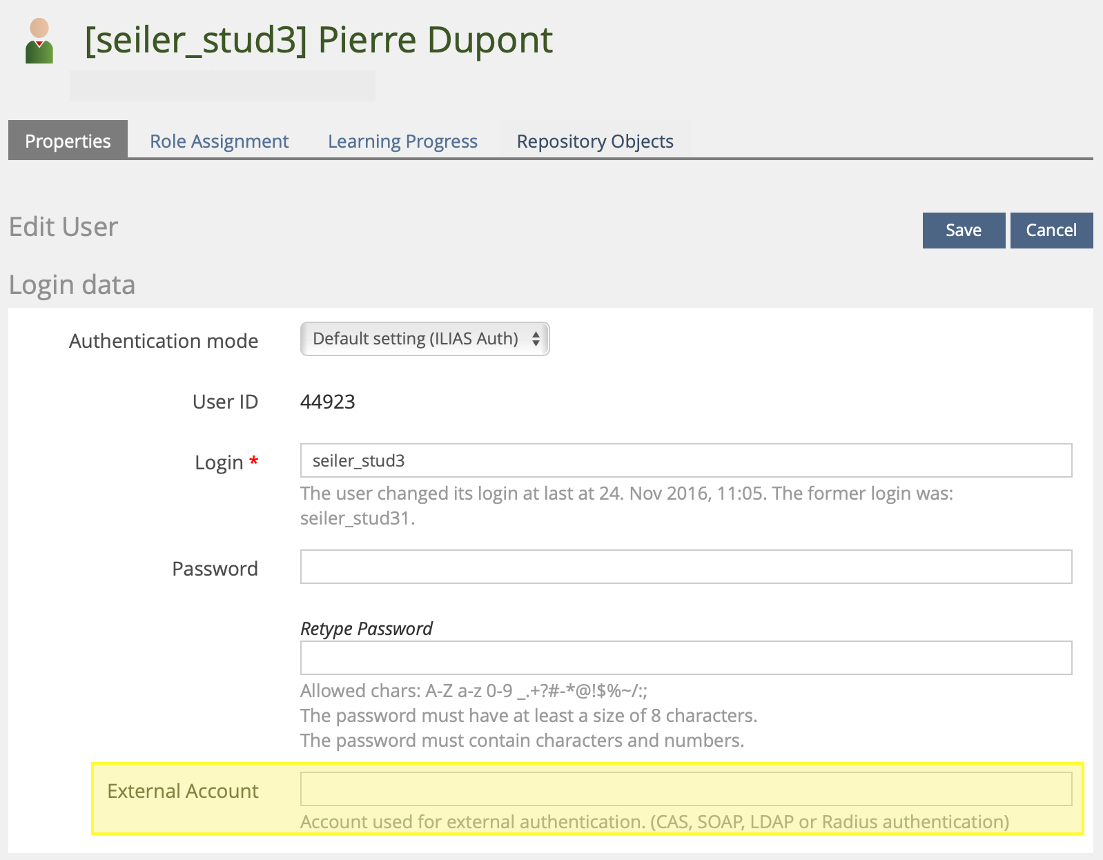 A new column "External Account" shall be added to the table of the User Accounts tab. It contains the information that is available in the user profile under "External Account".