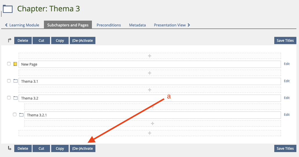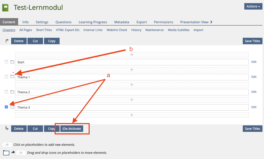In the ILIAS learning module, in the content (Editing-view), users with edit-rights are allowed to activate or deactivate chapters and/or sub-chapters.