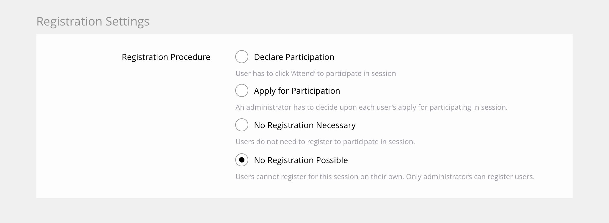 Meyer, Stefan [smeyer], 31. Aug 2020: I support this request but suggest to rename the old option "No Registration necessary" to "Registration Disabled" and to switch both options in the session settings.