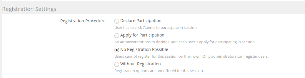 JourFixe, ILIAS [jourfixe], 28 SEP 2020 : We highly appreciate this suggestion and schedule the feature for ILIAS 7. We prefer to rename the existing option "No registration possible" to "Without registration" and put it an the end of the list of options.